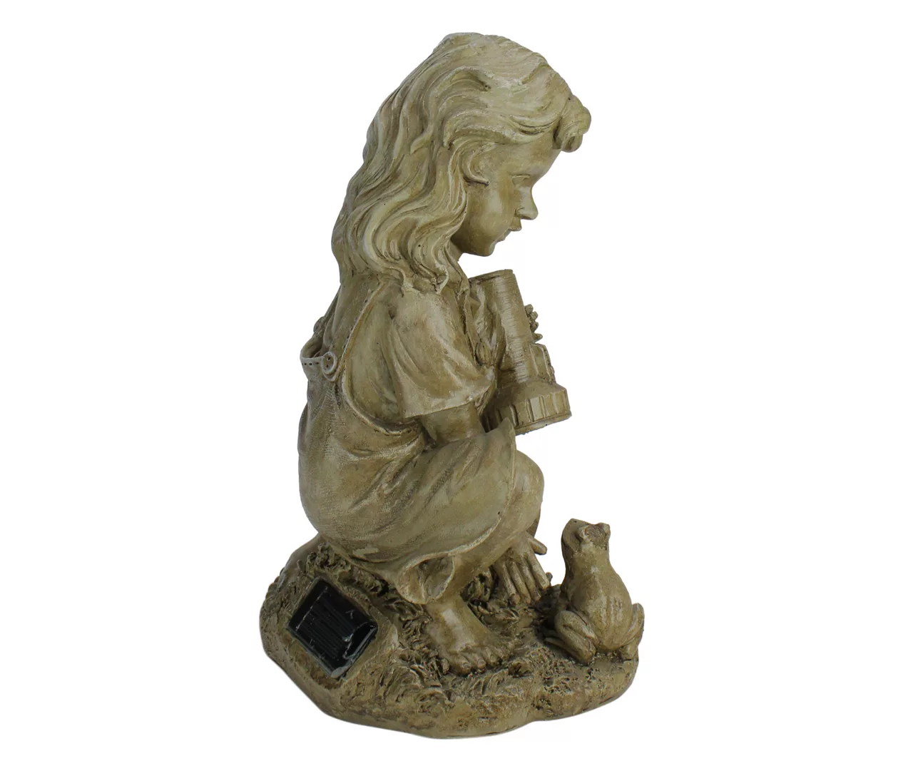 Accent your garden or walkway with this LED lighted solar-powered garden statue. It represents a girl examining a frog with her flashlight while the frog looks up in amusement. Add a bit of wonder to your outdoor area this summer thanks to the timeless design that inspires smiles in every glance.