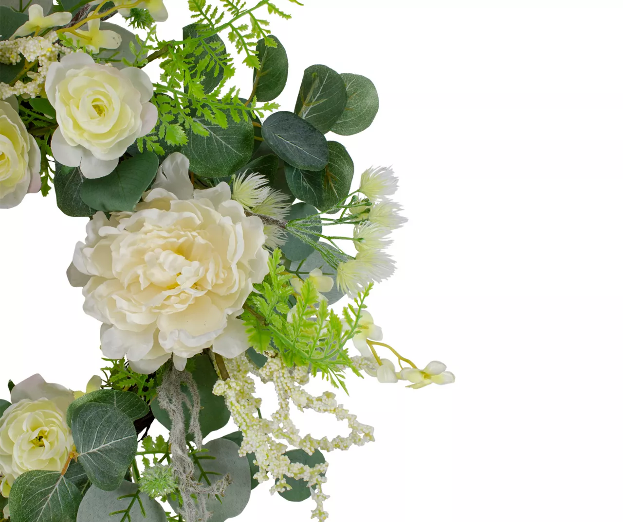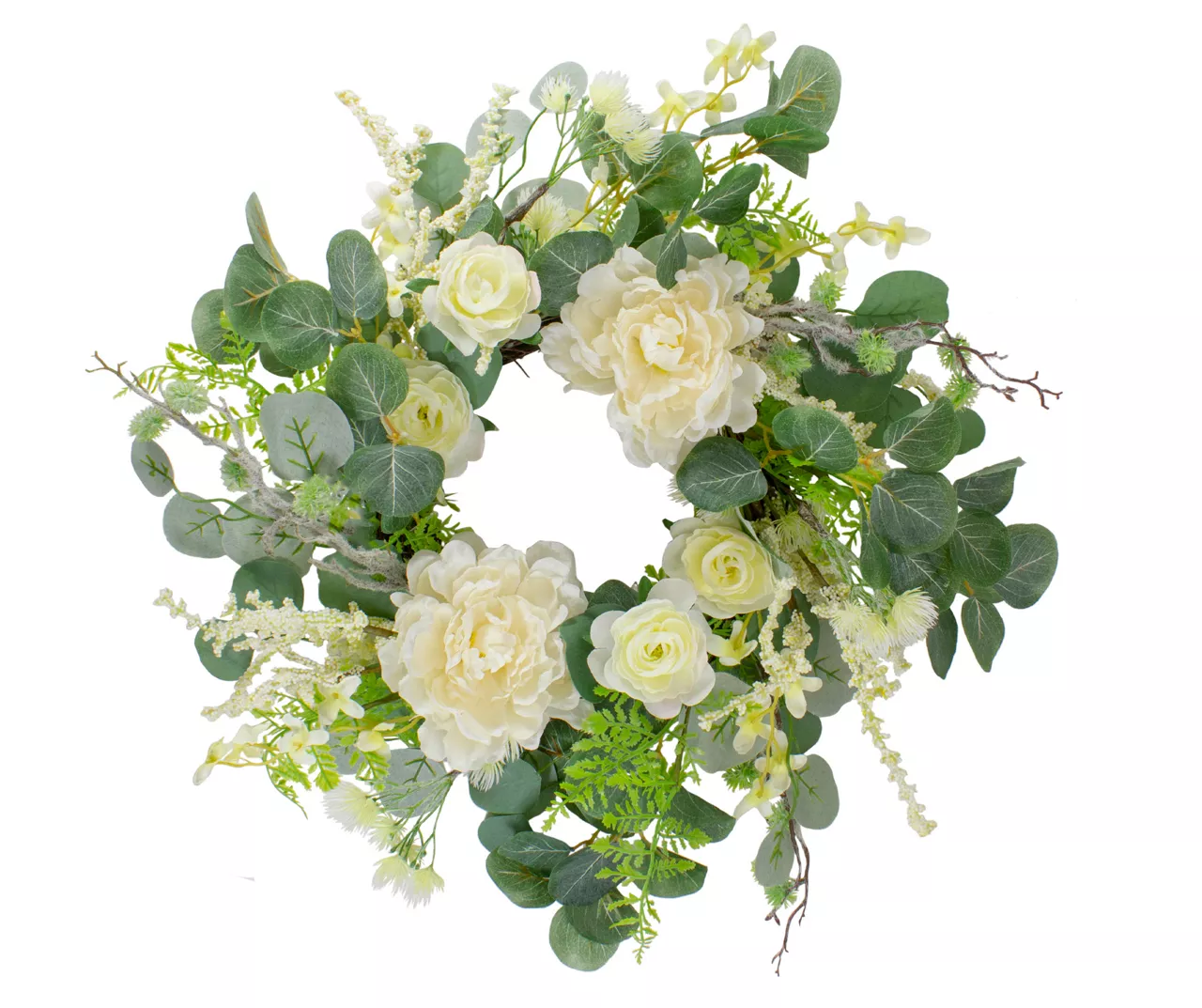 Add a touch of spring to your dĆ©cor with this blossoming floral wreath. A variety of peony and small flowers are arranged on a circular twig grapevine with green leaves. It’s a stunning seasonal addition to a living space, entryway or kitchen.