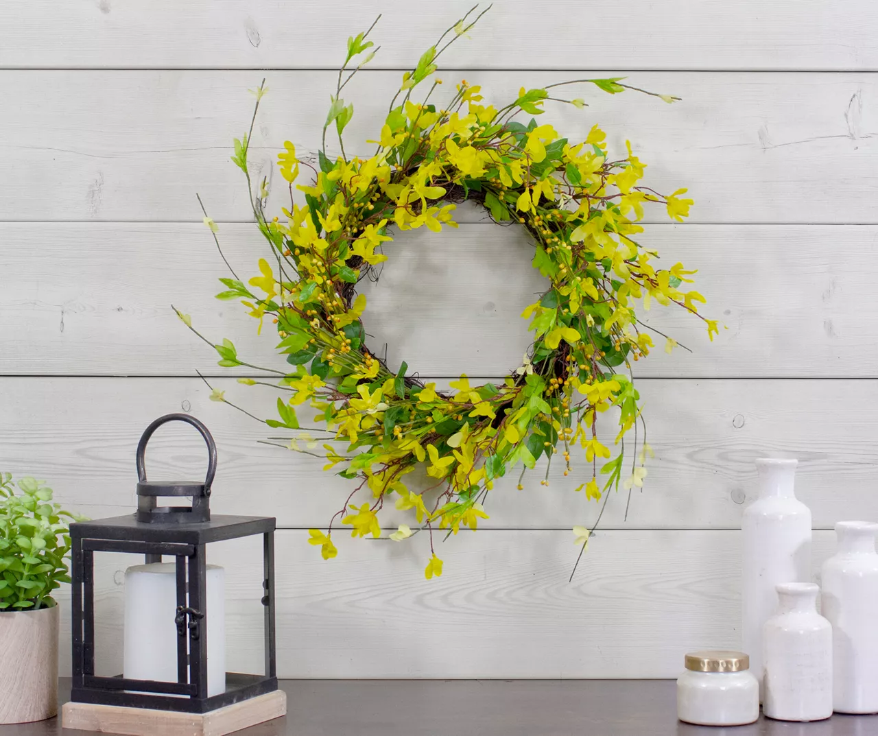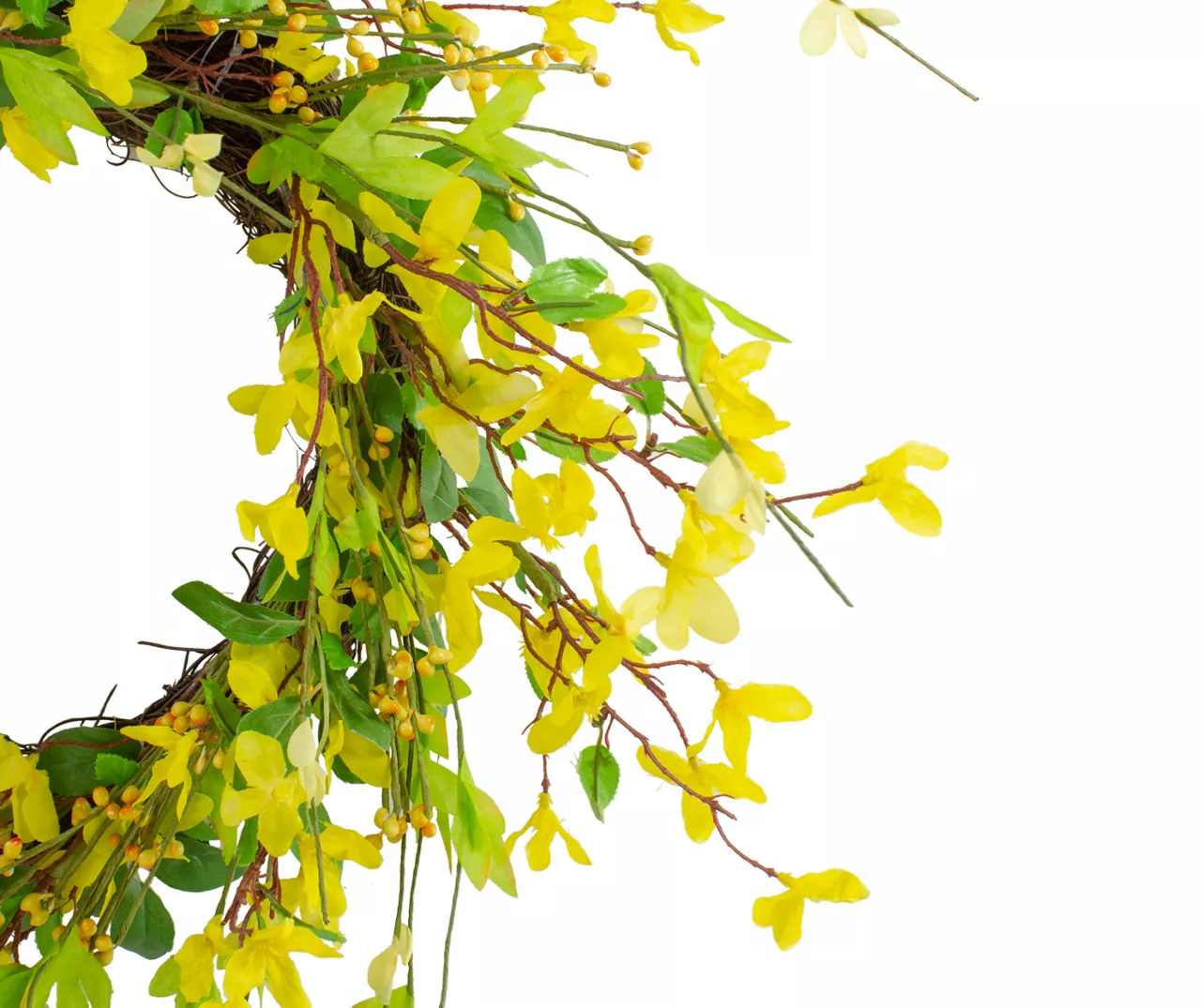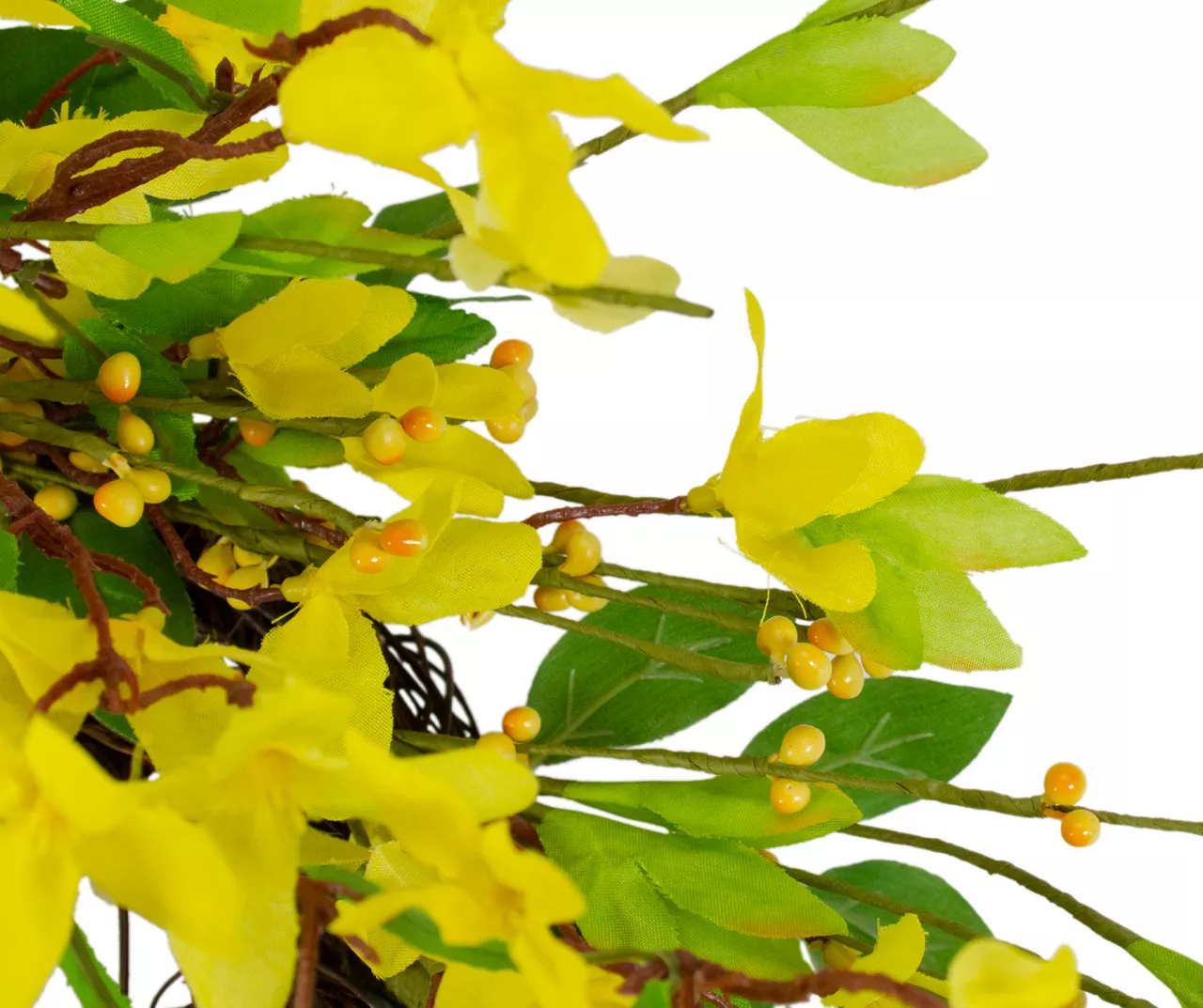 Add a dramatic touch of color to your home this spring with this life-like forsythia wreath. Realistic yellow silk flowers are intertwined with twigs and green leaves. It’s a charming seasonal addition to a living space, entryway or kitchen.