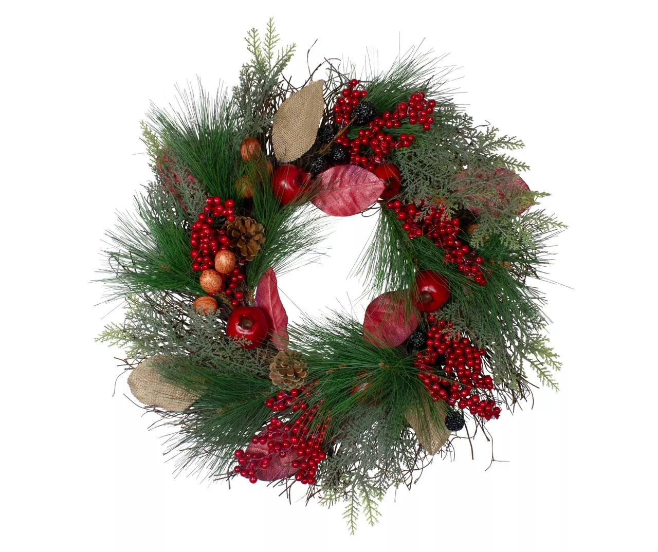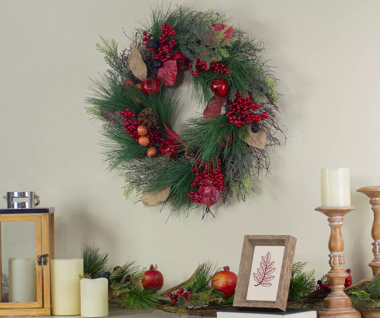 Bursting with berries, nuts and pine cones over a mixed pine leaf base topped by burlap and metallic amber leaves, this wreath from Northlight is perfect for thanksgiving and the autumn season. It’s sure to be the focal point of your holiday decor while adding pops of color, and can be hung over mantels and doorways or on walls and windows.