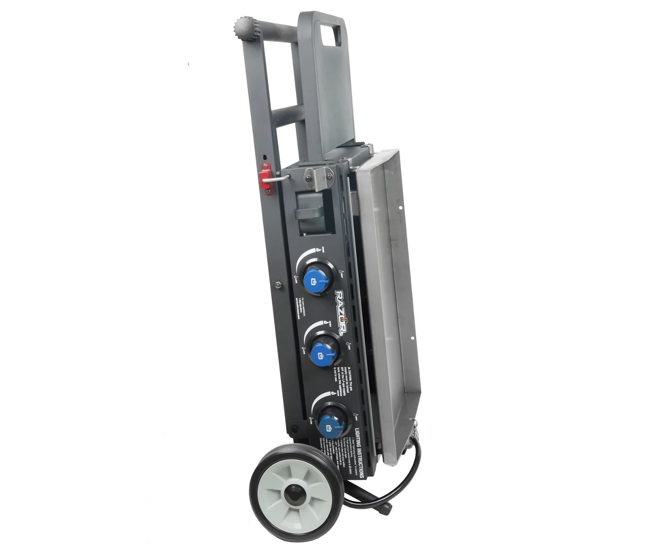 This three-burner portable Razor griddle grill has plenty of room to cook all your favorite foods, making it perfect for backyard barbecues, camping and tailgating. The stainless steel burners with a total 30,000 BTUs of heat easily come to life with push and turn ignition. The large capacity, pre-seasoned griddle is able to cook up to 31 burgers at a time, fry up some eggs, sizzle some bacon or even do stir fry. The side shelf offers extra space for food preparation as the secure front access drain and cup offers easy grease disposal. Versatile surface for cooking breakfast, lunch and dinner. Unique mobile cart design makes it easy to fold for storage or transportation.