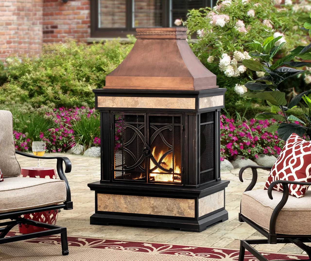 There’s nothing quite like an evening outside around a fire. Make every night at home feel special with this outdoor wood-burning fireplace from Sunjoy. Made of ceramic tile and powder-coated steel, the classic design is sure to complement any traditional outdoor setting. Unlike open fire pits, the smoke from this fireplace is directed up and away via the functional chimney while a mesh screen provides protection from embers and sparks. The removable grate makes ash clean up easy. Curl up for a cozy evening under the stars or invite friends and family over to roast marshmallows.