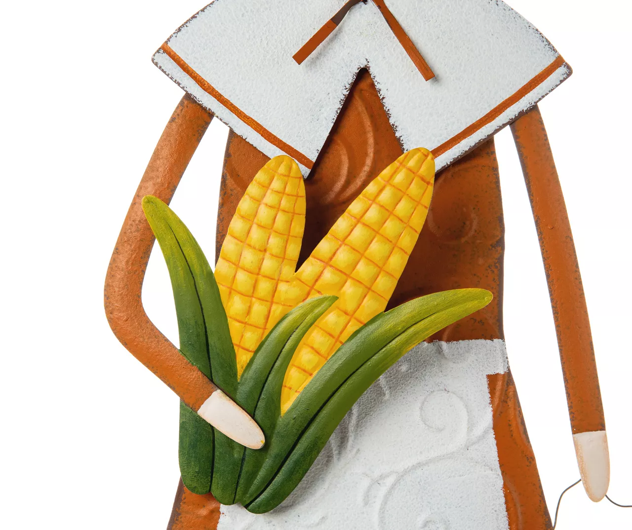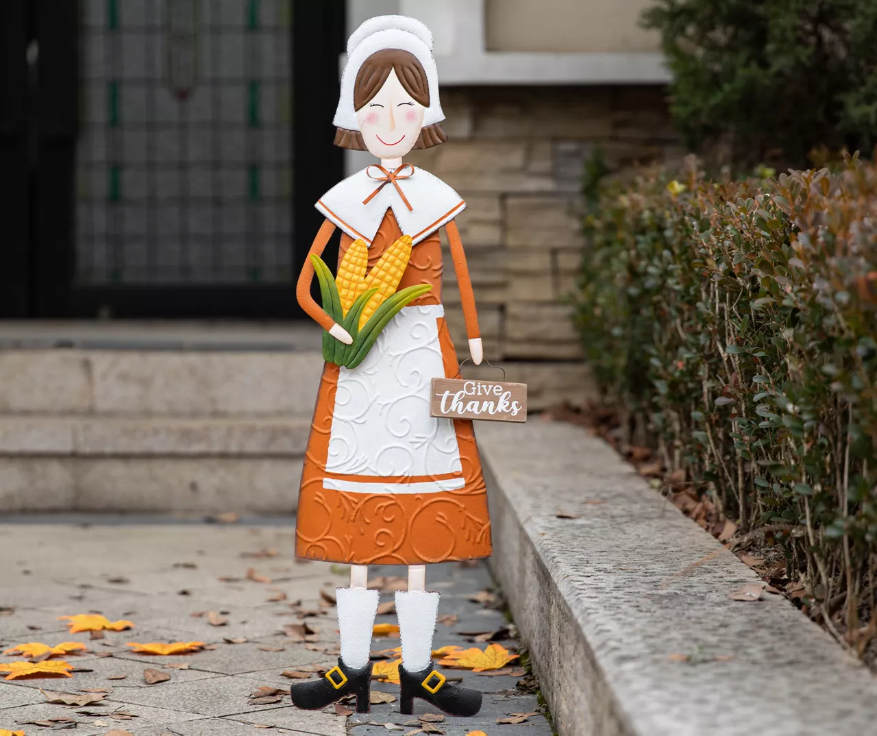 The adorable yard stake will brighten your garden in Thanksgiving Day charm! This yard stake is made from metal and features with the cute pilgrim girl, embellished with a bundle of corn, textured clothes and a “give thanks” sign in her hand. It also offers a delightful way to greet guests on the front porch, or to add a splash of color and character to your backyard.