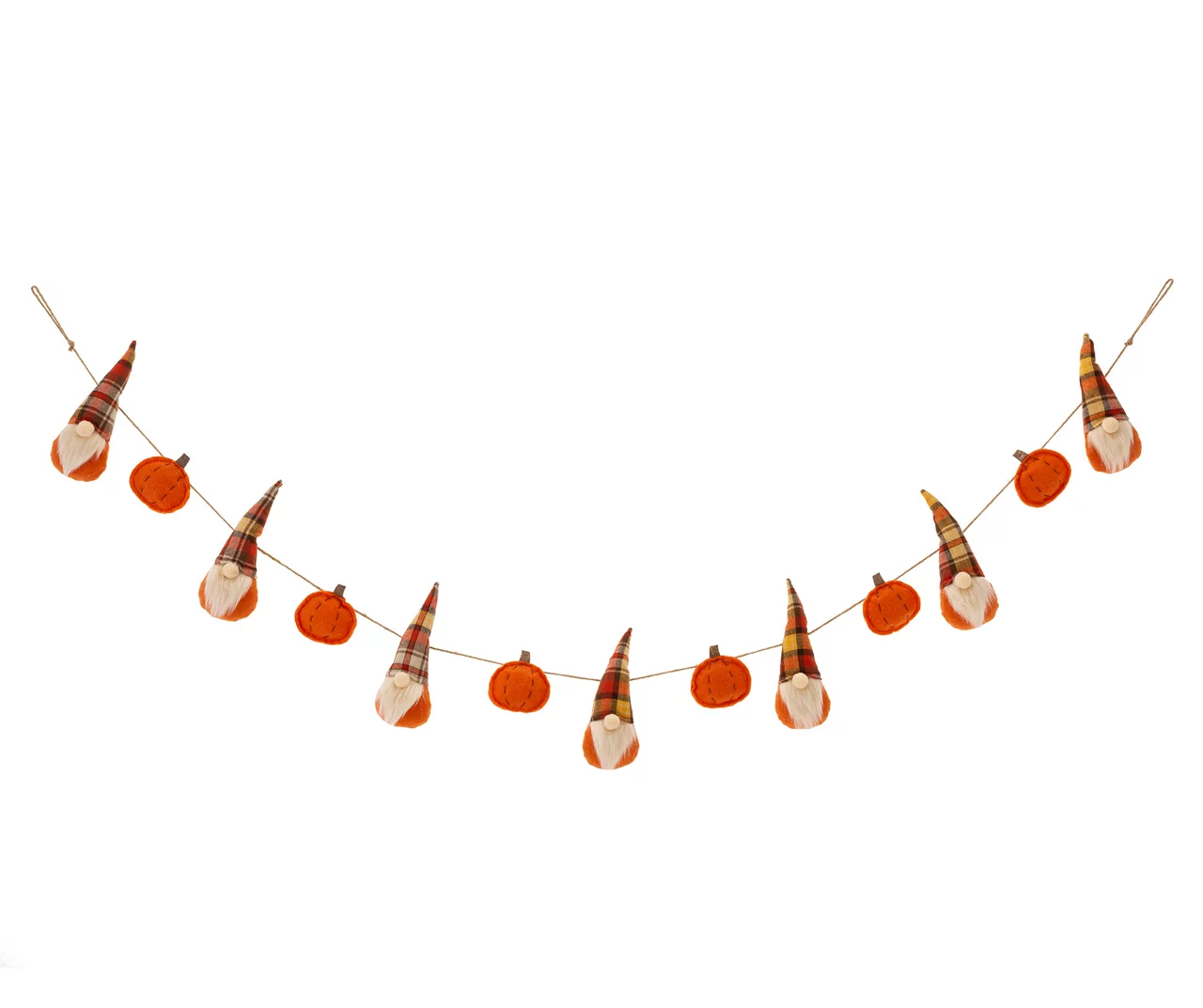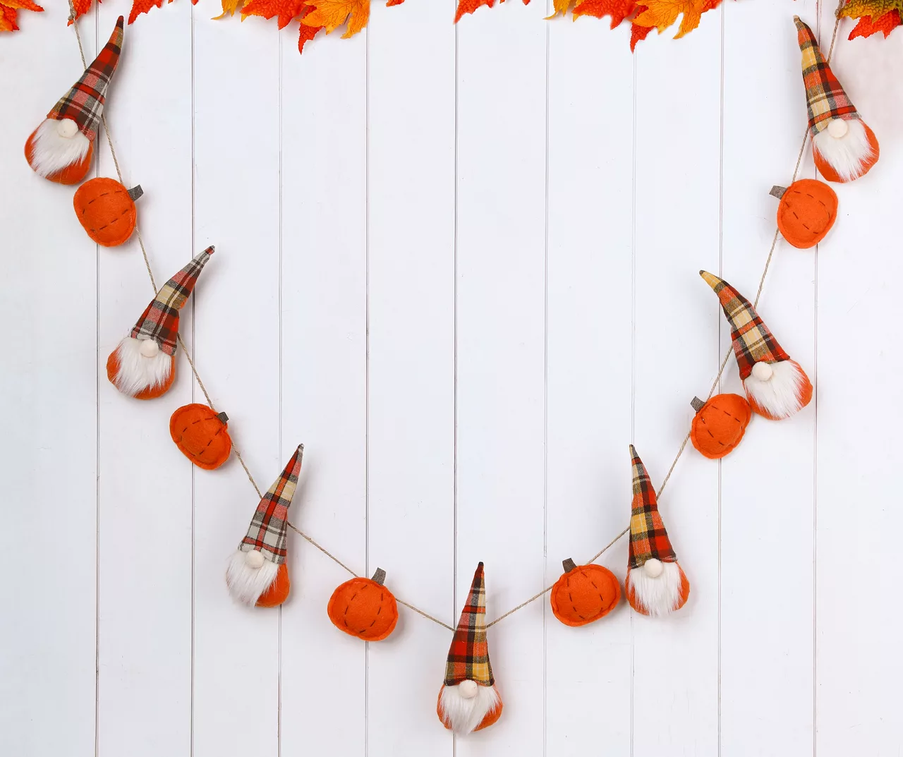 Decorate your home this autumn with this charming gnomes and pumpkins garland. With plaid gnomes and orange pumpkins, this garland is the perfect way to bring some Thanksgiving spirit to any space. Perfect for a mantel walls and more.