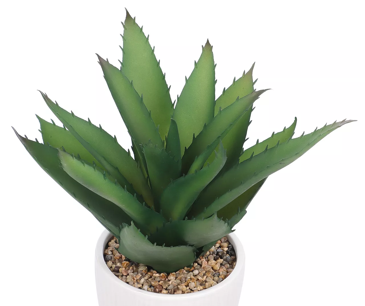 Add an exotic nature’s touch to your home without the upkeep displaying this artificial plant! A realistic aloe is featured in a rock bed within a round ceramic planter in white with a ribbed texture. This maintenance-free plant is a great addition to a mantel, table or shelf.