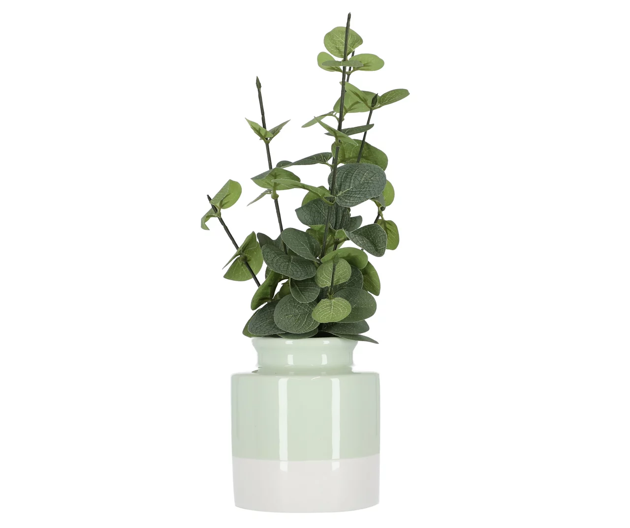 Bring the calming serenity of nature to your home without the upkeep displaying this artificial plant. Realistic greenery is featured within a ceramic vase in a two-tone green and white look. This maintenance-free arrangement is a great addition to a mantel, table or shelf.