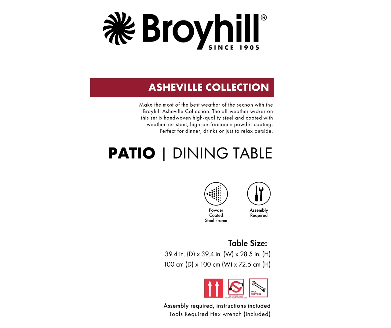 Gather outdoors for conversation and delicious meals around the Asheville dining table by Broyhill. The square shape table features a powder-coated steel frame hand painted to look like wood with a slat-style top. Complete with a convenient umbrella hole for shading your favorite spot, this dining table is an elevated addition to a patio or deck.