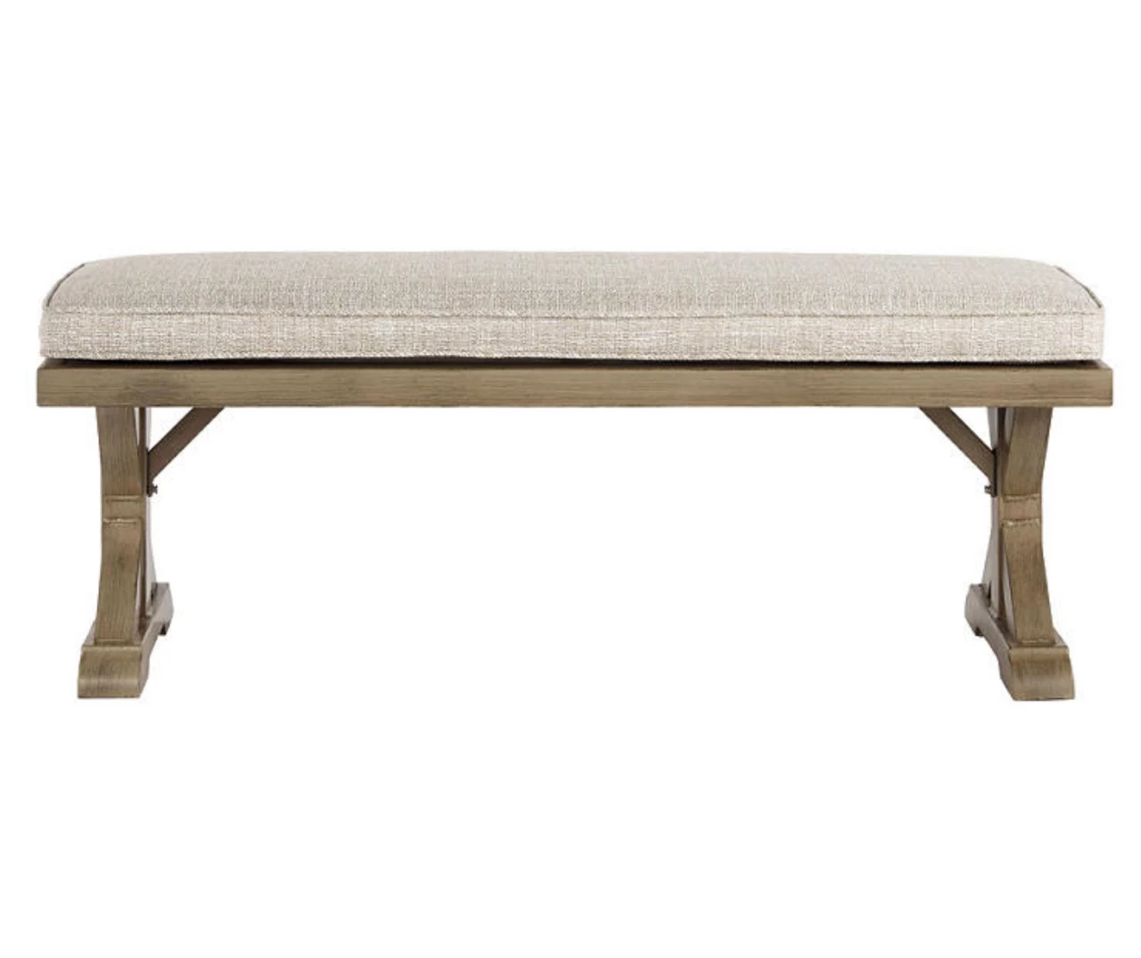 Sporting an easy-on-the-eyes look inspired by driftwood, this bench with cushion elevates the art of indoor-outdoor living. Beautiful and durable enough for indoor and outdoor use, this casually cool bench entices with striking X-leg farmhouse styling and a plush, removable cushion wrapped in high-performing Nuvella fabric that’s a breeze to keep clean.