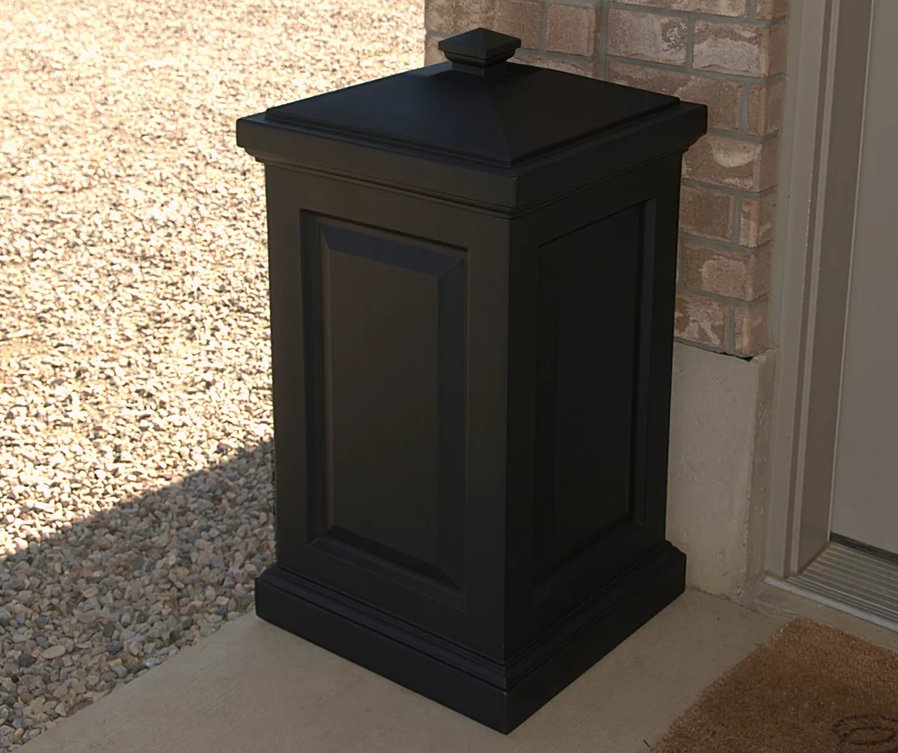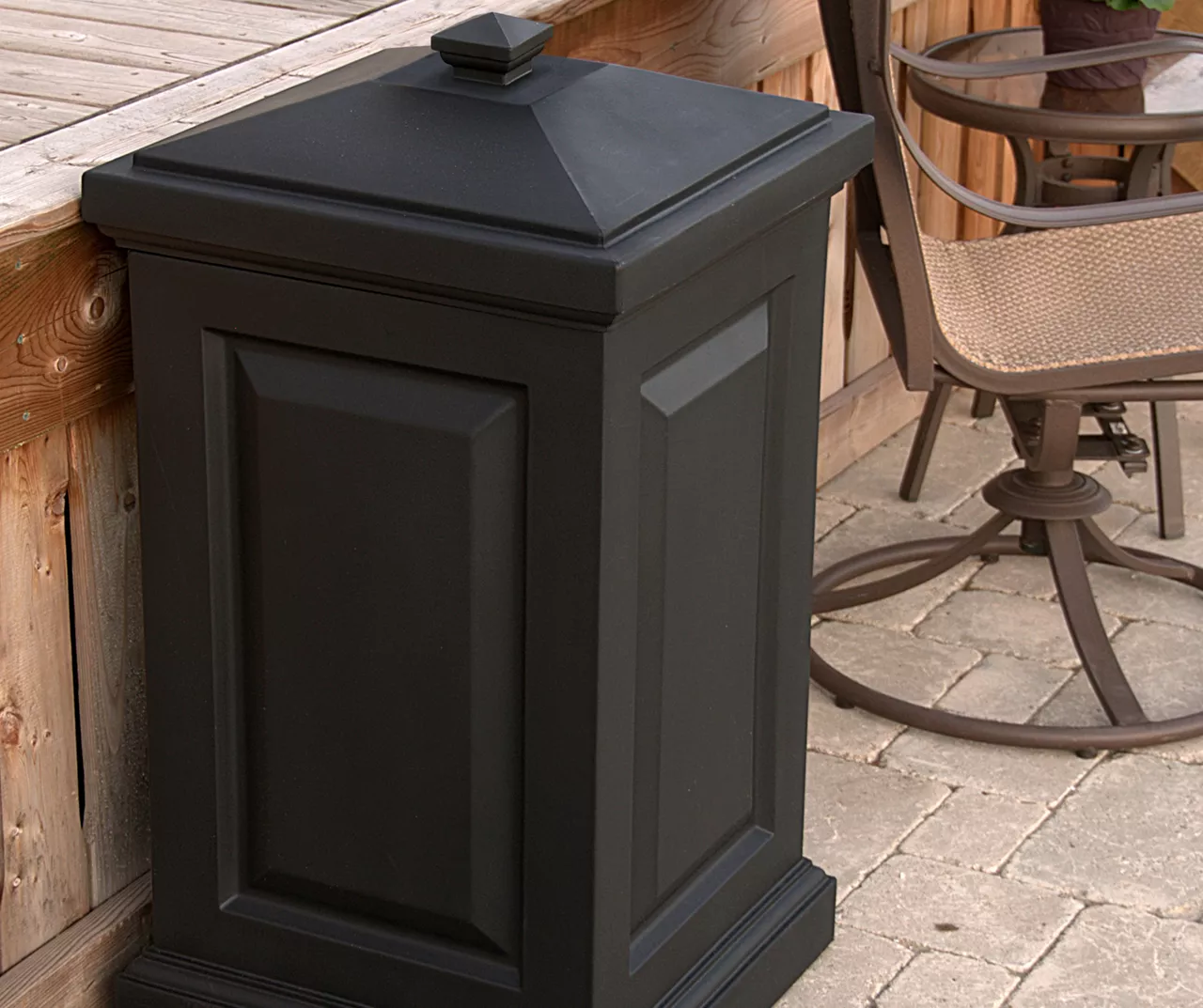 Mayne’s multi-purpose storage bin offers a perfect blend of elegant style and functionality. This black waste bin is ideal for a backyard or anywhere outdoors and includes a set of hooks to hang your waste bag within. It’s also versatile way to hide children’s toys, gardening tools, bird seed, or bags of salt for the winter months.
