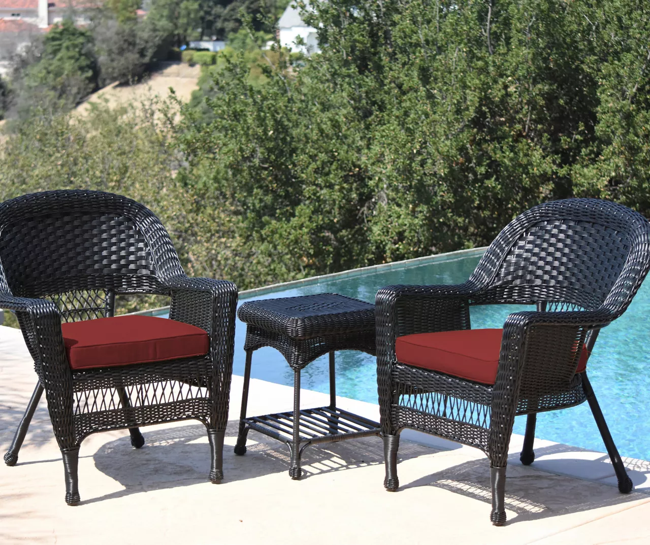 - Includes 2 – chairs with seat cushions and end table
