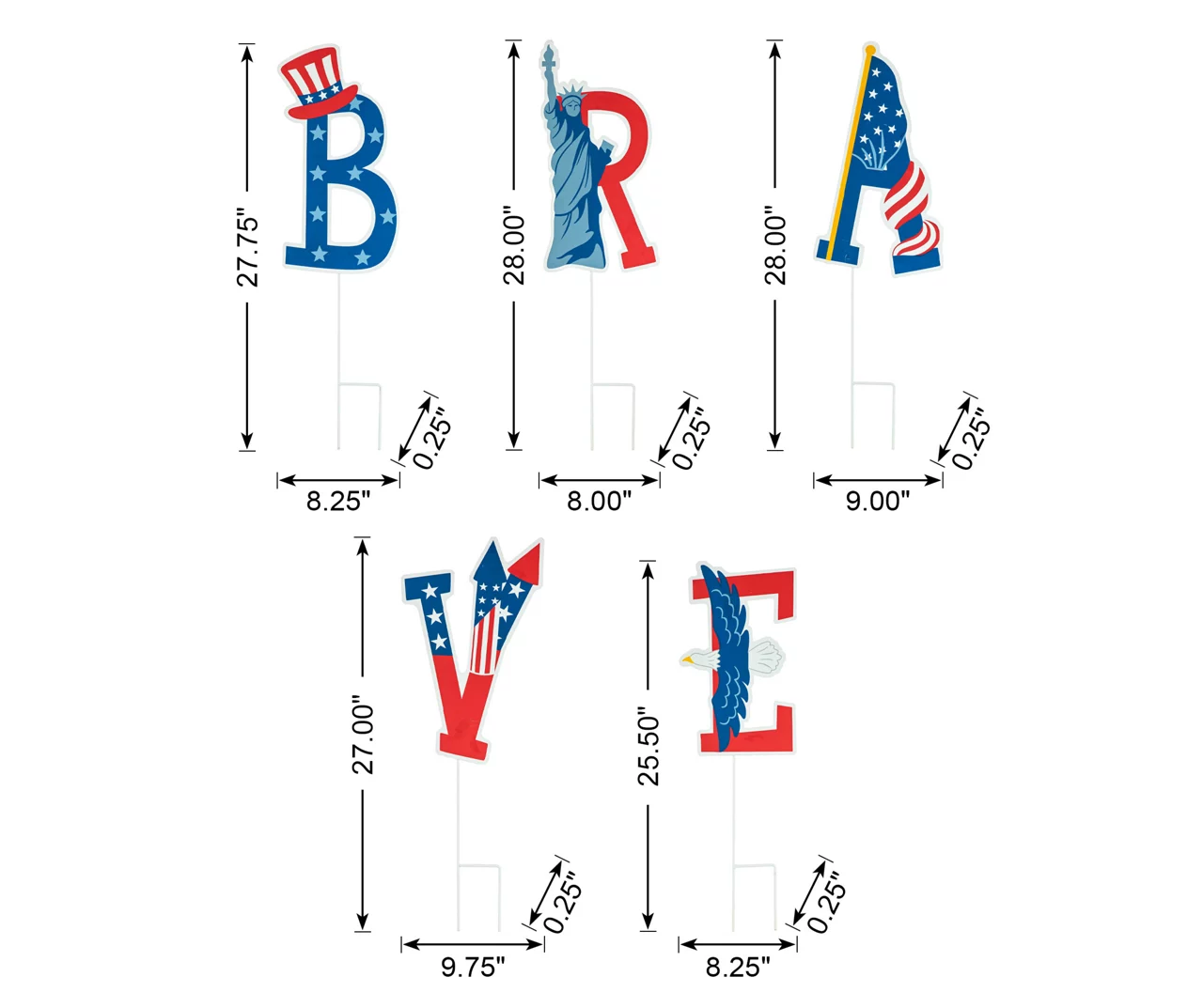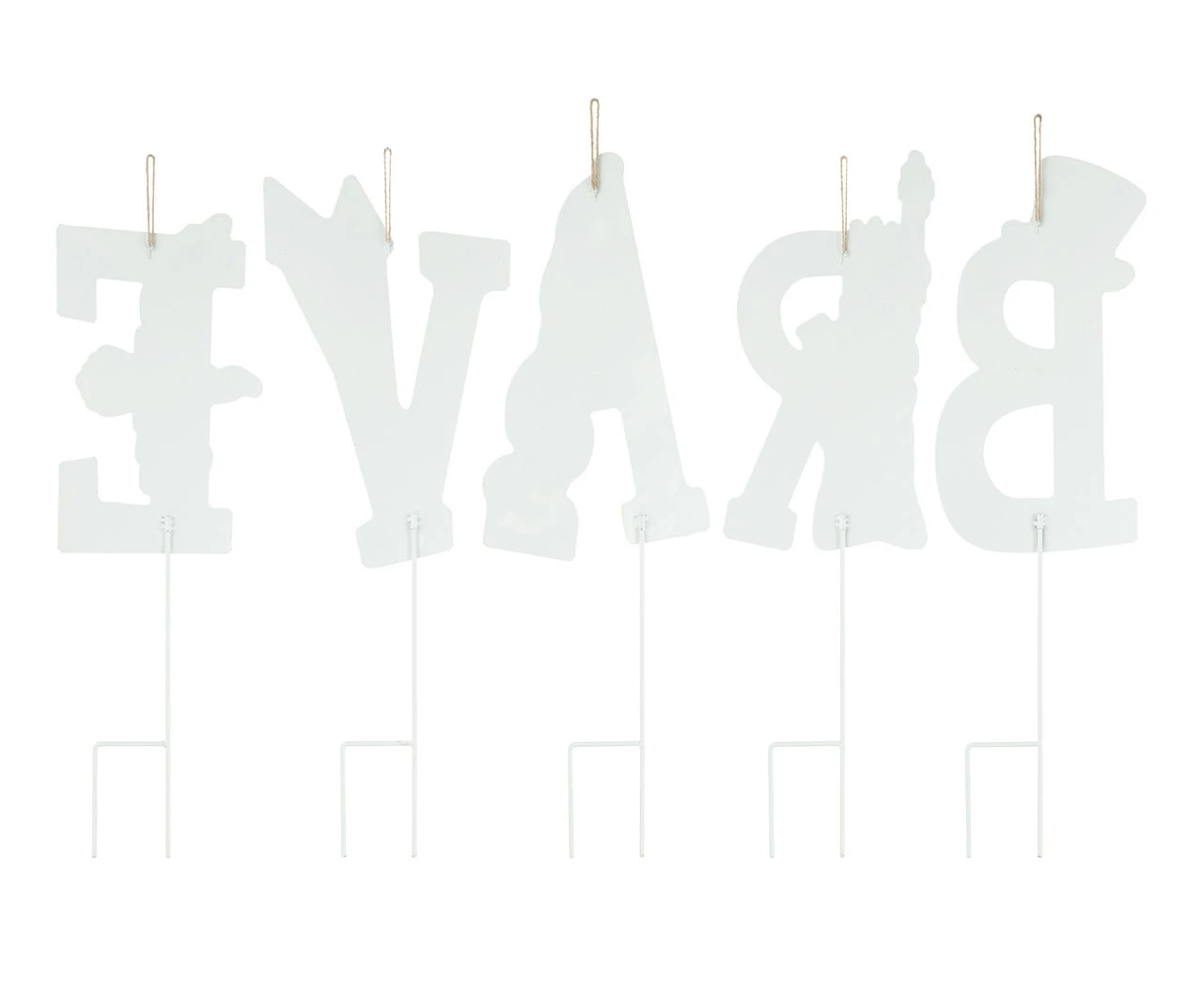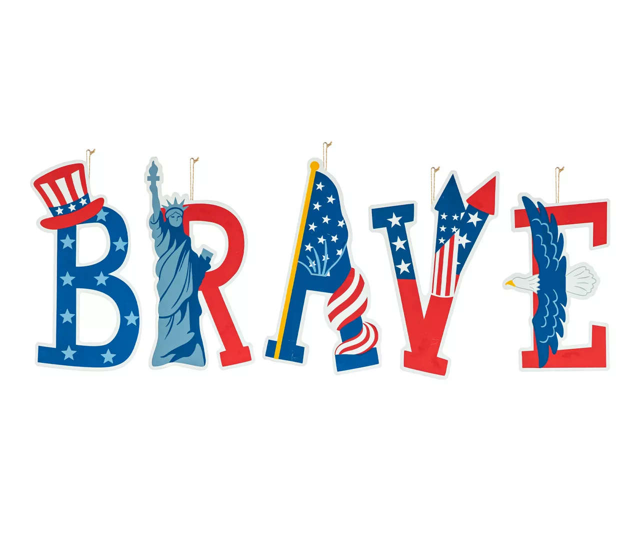 Land of the free because of the brave. This five-piece yard stake set writes out the perfect theme for your Independence Day celebrations. “Brave” is written out in oversize red, white and blue letters and accented with classic icons of the Statue of Liberty, a bald eagle, Uncle Sam’s hat, fireworks and a flag. This set can display around your yard or alternatively as wall dĆ©cor on the porch.