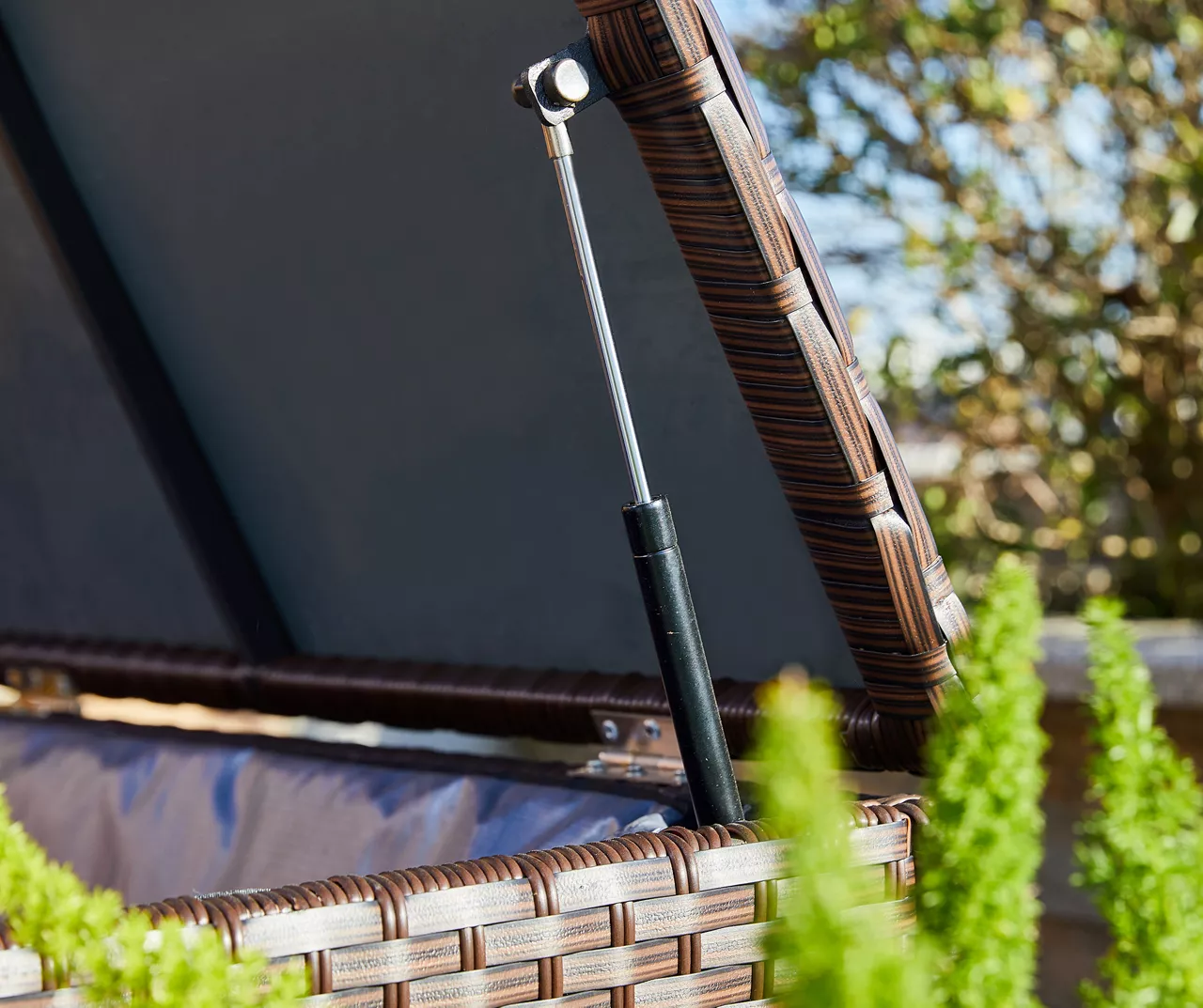 Store your outdoor cushions, pillows, toys and more in style with this outdoor storage box. It’s made with an anti-rust steel frame that is durable and sturdy and covered in a decorative handwoven all-weather wicker featuring a brown look. A gas lift mechanism raises the lid with soft closing as the included Oxford liner keeps items from getting wet inside.
