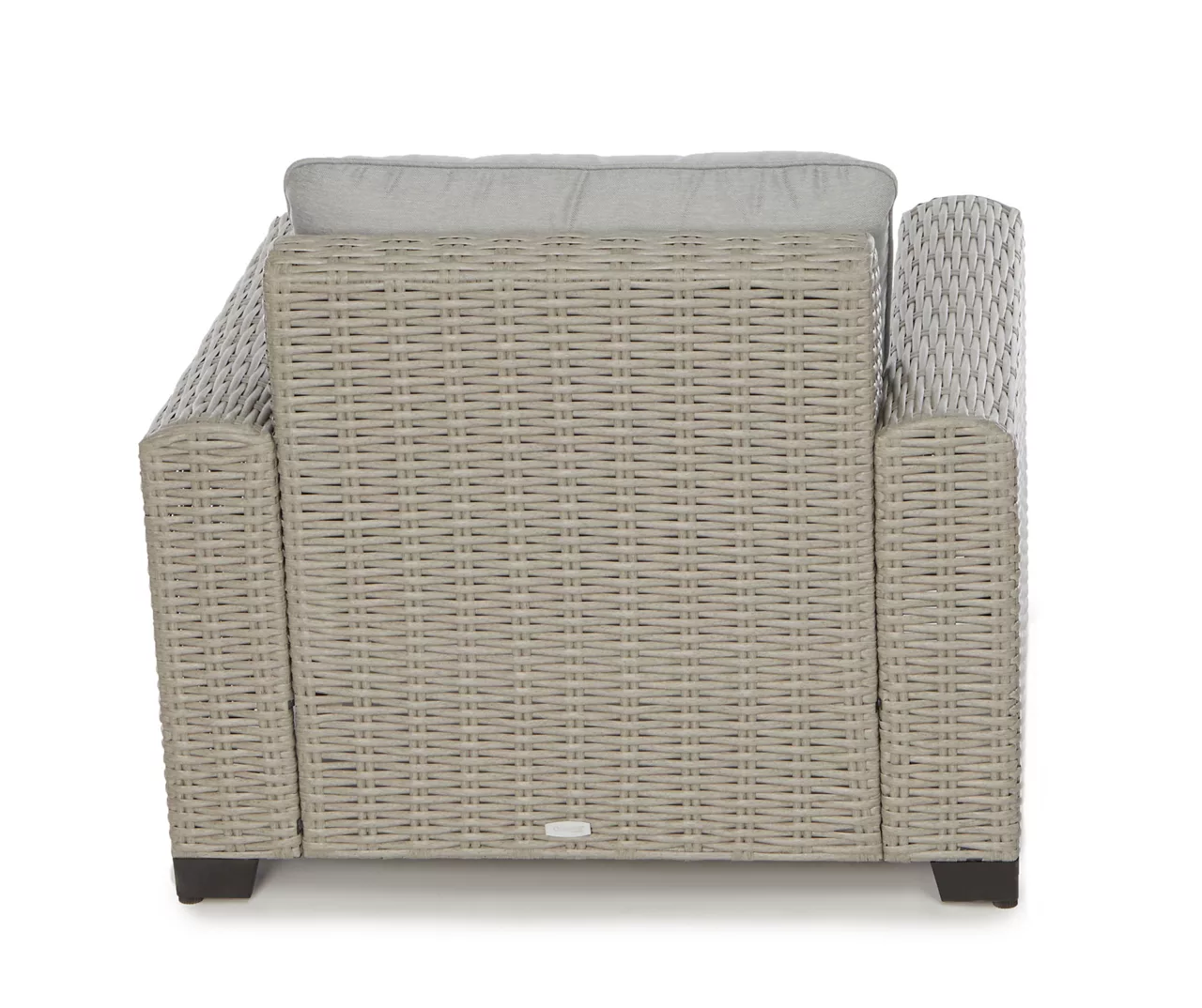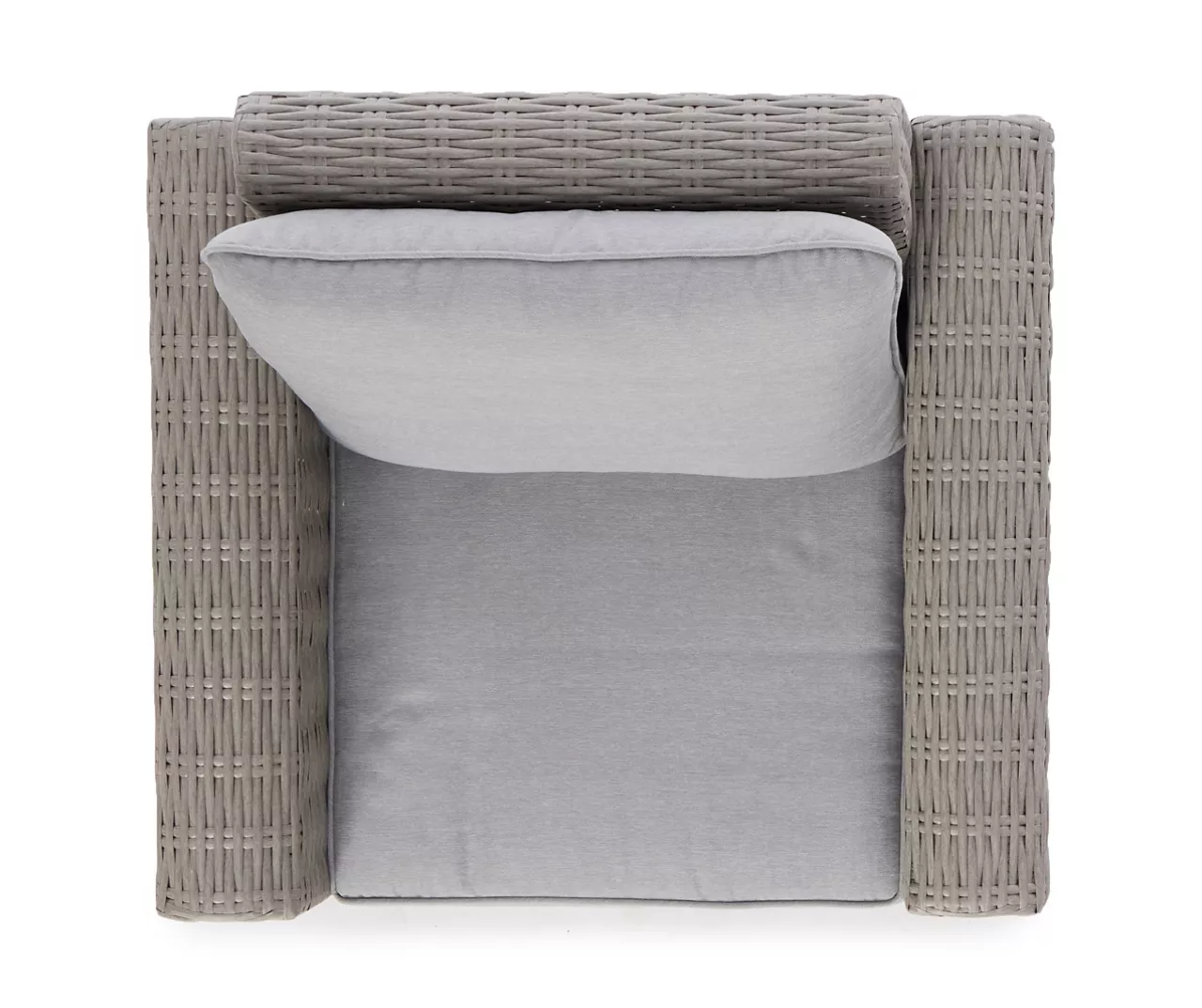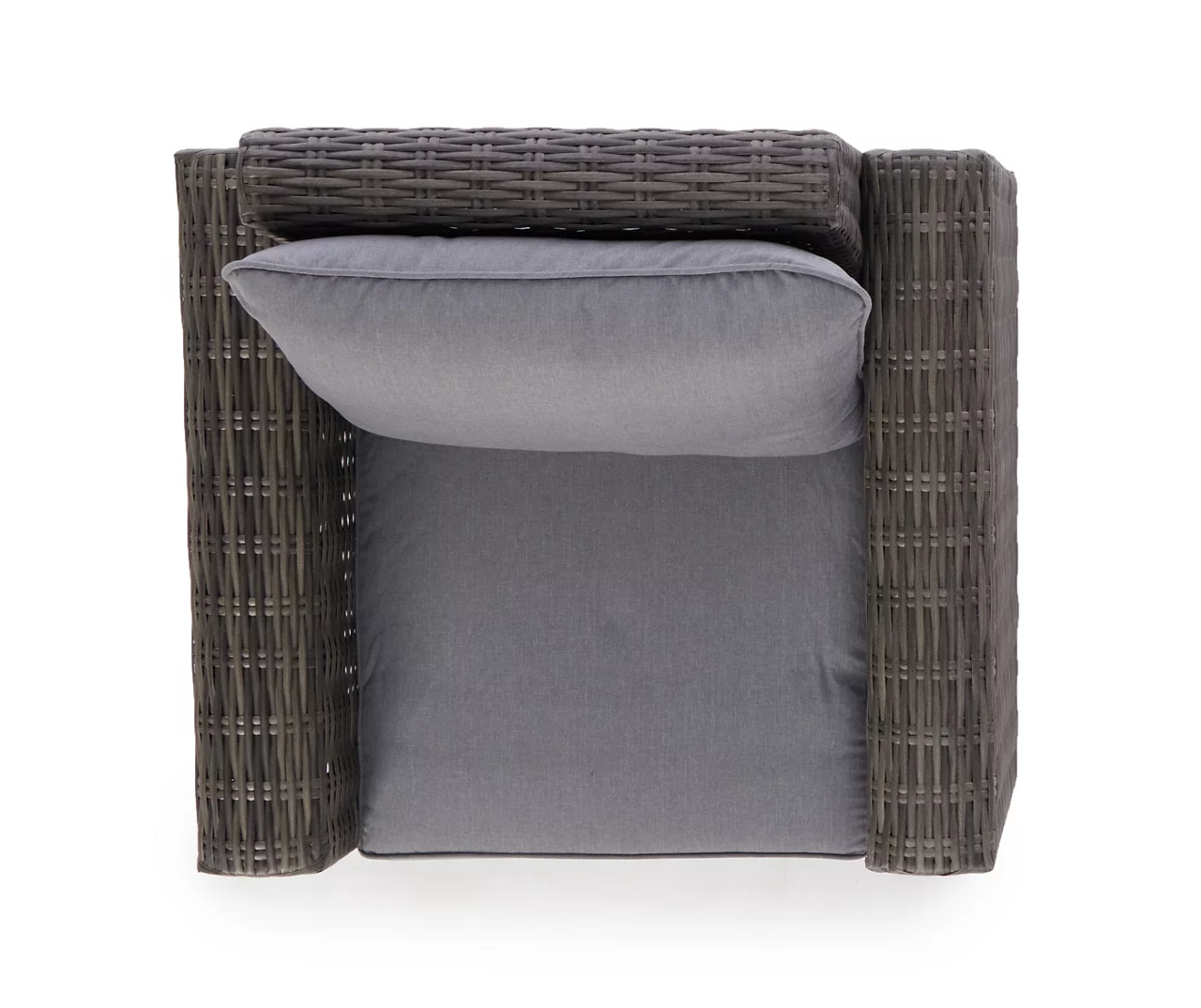 - Oversize deep seating cushions made from fade-resistant olefin fabric in gray