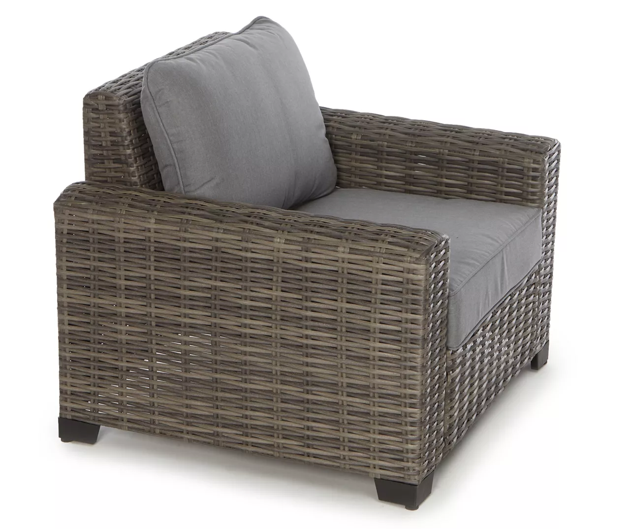 Gather outdoors in modern-inspired style with the Pembroke lounge chair by Broyhill. The armchair exudes design with a clean-line profile constructed with rounded track style arms and back in a half-round, handwoven all-weather wicker. Deep, oversize seating and pillow back cushions are made of fade-resistant olefin fabric in a neutral gray to provide a cozy, comfortable rest.