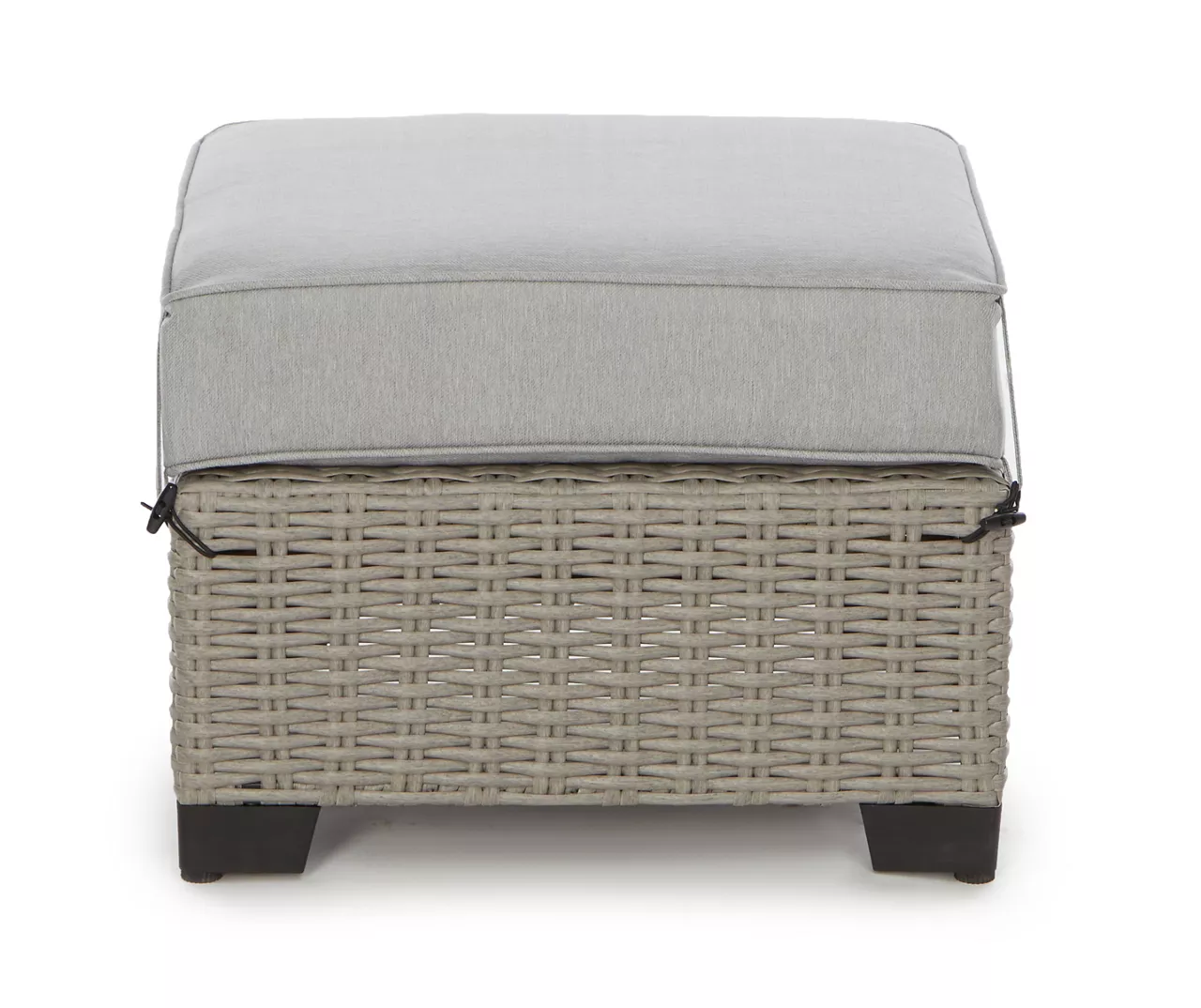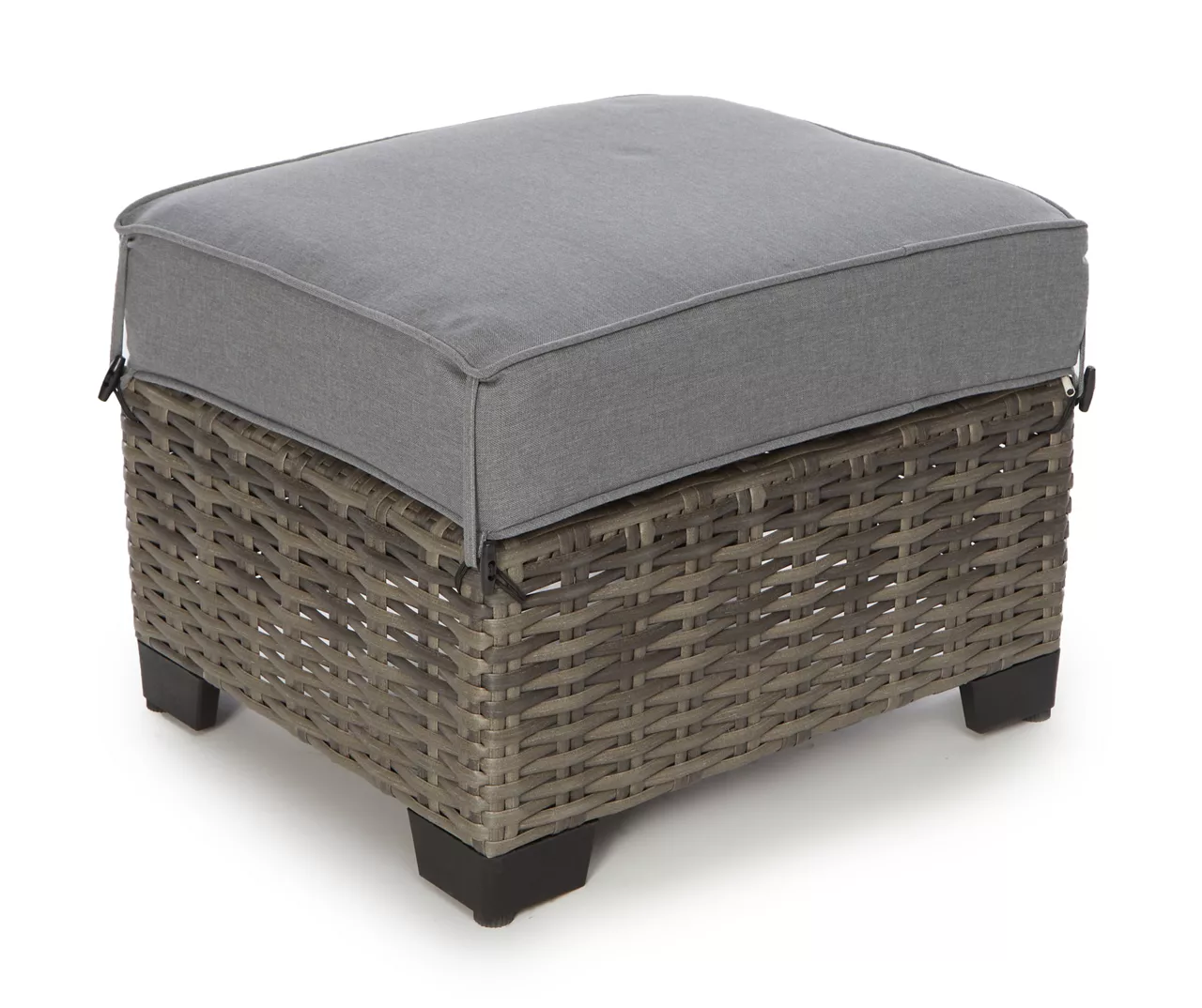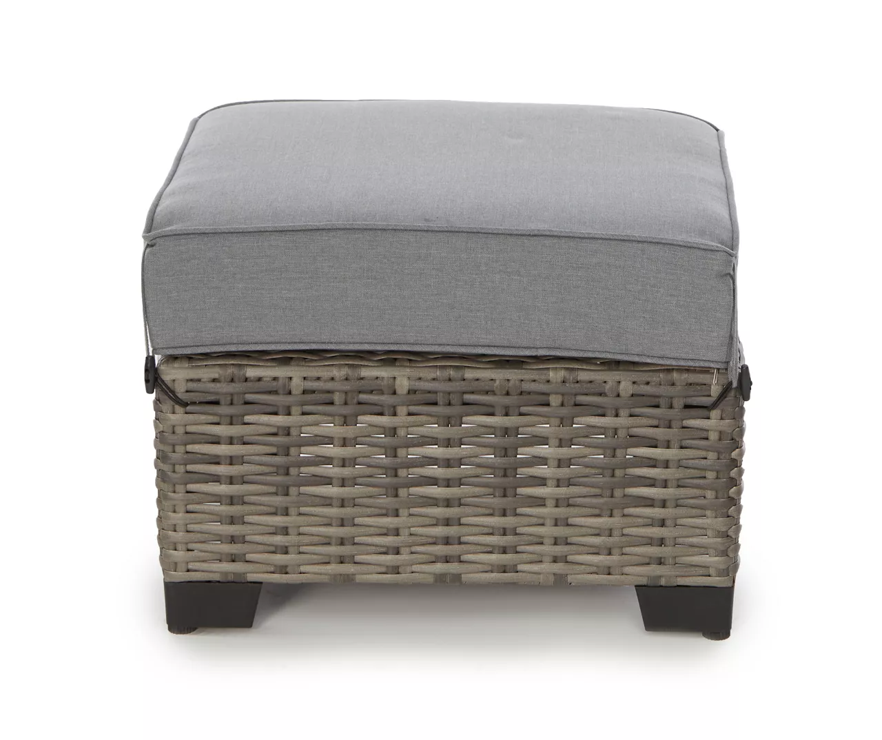 Take a moment to relax in your favorite outdoor spot using the Pembroke ottoman by Broyhill. The square profile exudes design with a clean-line profile construction with half-round all-weather wicker along the base. Topped with a deep, oversize seating cushion made from fade-resistant olefin fabric in gray, this ottoman is perfect for using as an extra seat or for kicking your feet up on.