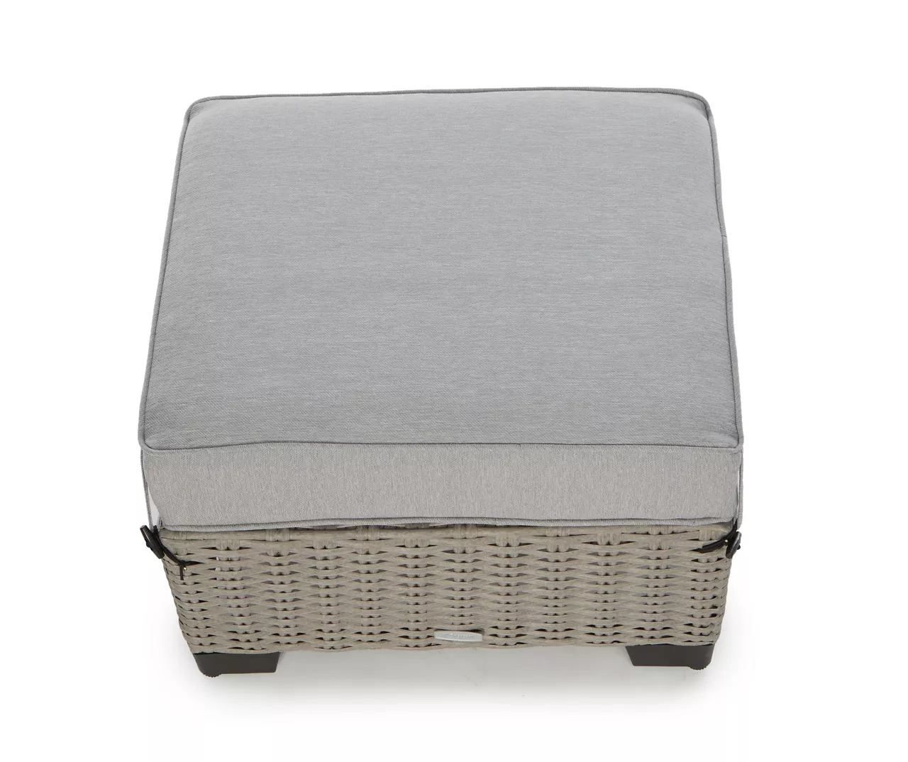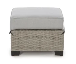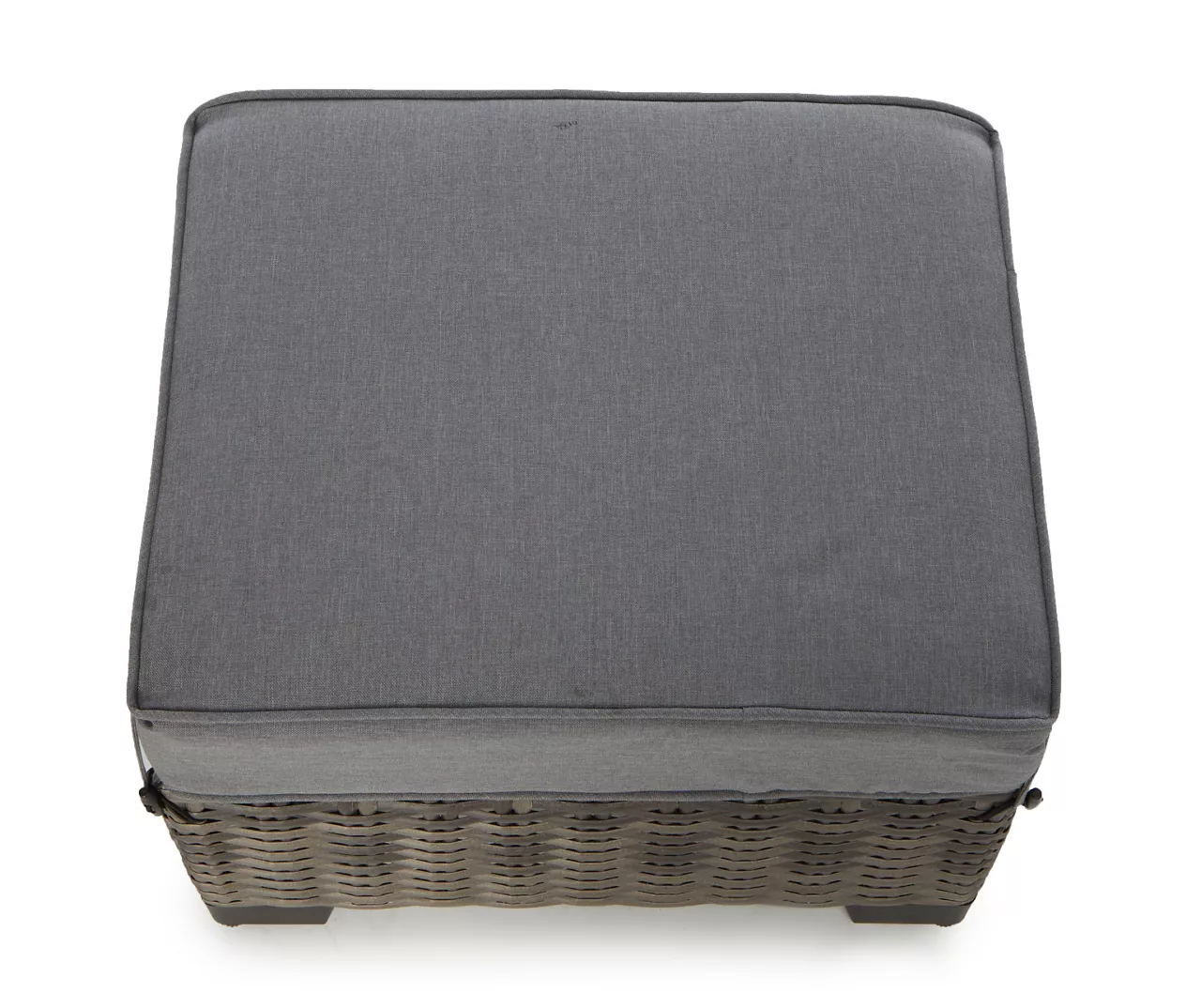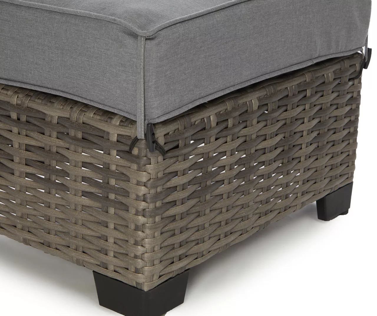 Take a moment to relax in your favorite outdoor spot using the Pembroke ottoman by Broyhill. The square profile exudes design with a clean-line profile construction with half-round all-weather wicker along the base. Topped with a deep, oversize seating cushion made from fade-resistant olefin fabric in gray, this ottoman is perfect for using as an extra seat or for kicking your feet up on.