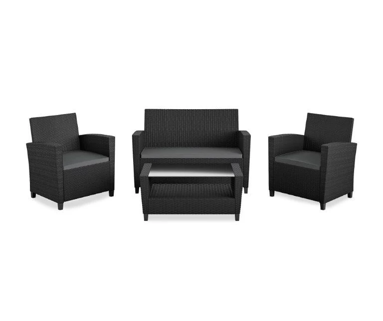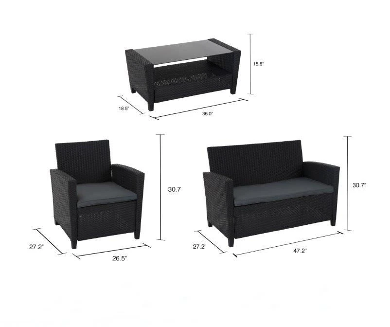 - Includes loveseat with cushions, 2 chairs with cushions and coffee table