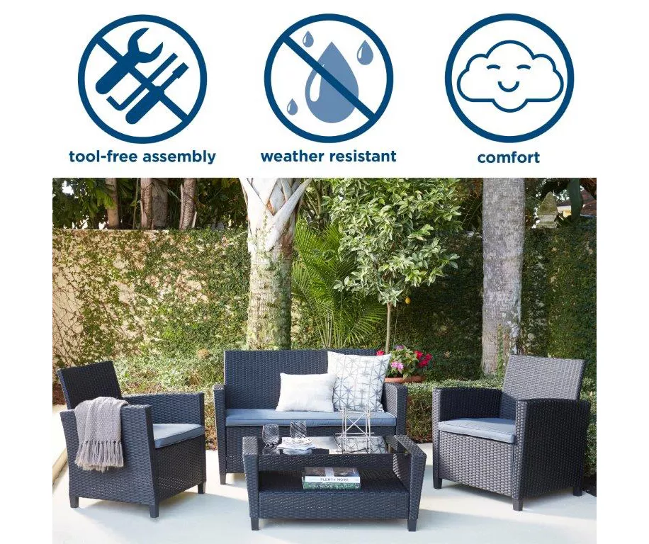 Create a cozy and comforting outdoor lounge area with Cosco’s Malmo four-piece resin wicker patio furniture set. Featuring resin wicker chairs with cushions, enjoy a night of comfortable relaxation and conversation with friends. A tempered glass coffee table with shelf completes this set, with a little bit of storage for a book or candle. Enjoy quiet time with a book or chat with a friend all night in this four-piece set.