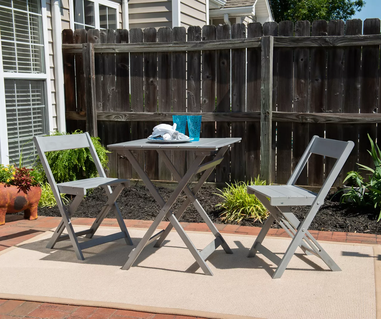 Add a stylish dining set to your porch or outdoor area with the Flint café set. With a sturdy and durable build finished in a lovely acorn color, this set easily compliments any home’s outdoor space. And, because the included chairs are foldable, storage is super easy.