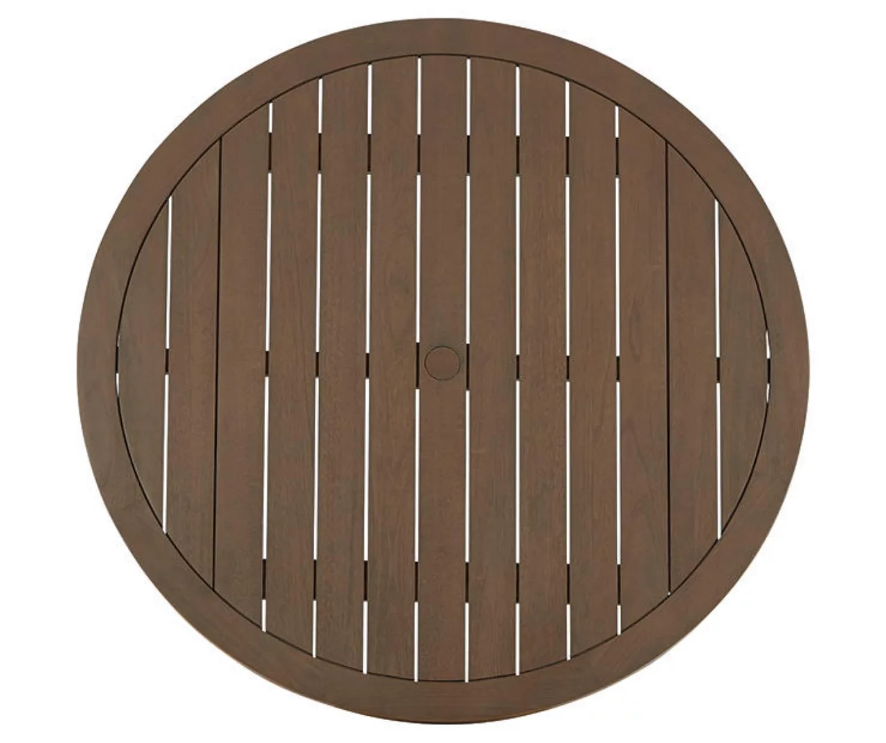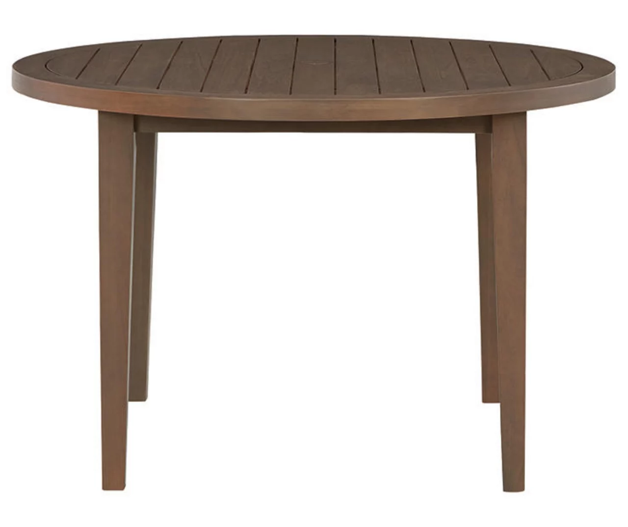 Round out your indoor or outdoor living space with the naturally beautiful look of wood in this round dining table. Crafted with eucalyptus, this durable wood table will serve up seasons of worry-free dining in your sunroom, on your deck or sitting pretty poolside. The option of adding an umbrella lets you throw some shade in your outdoor living space.