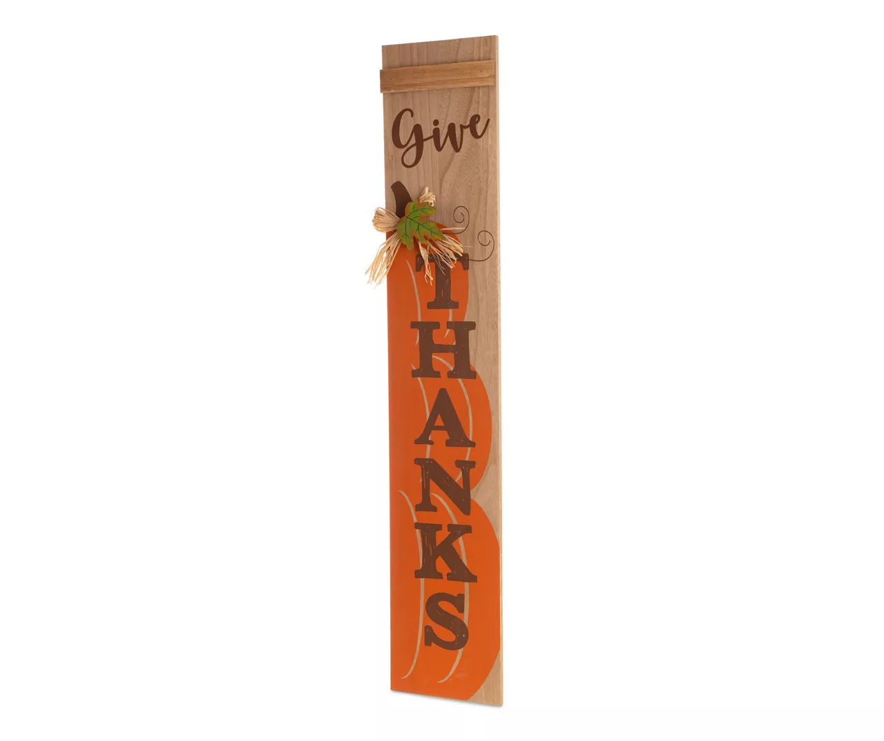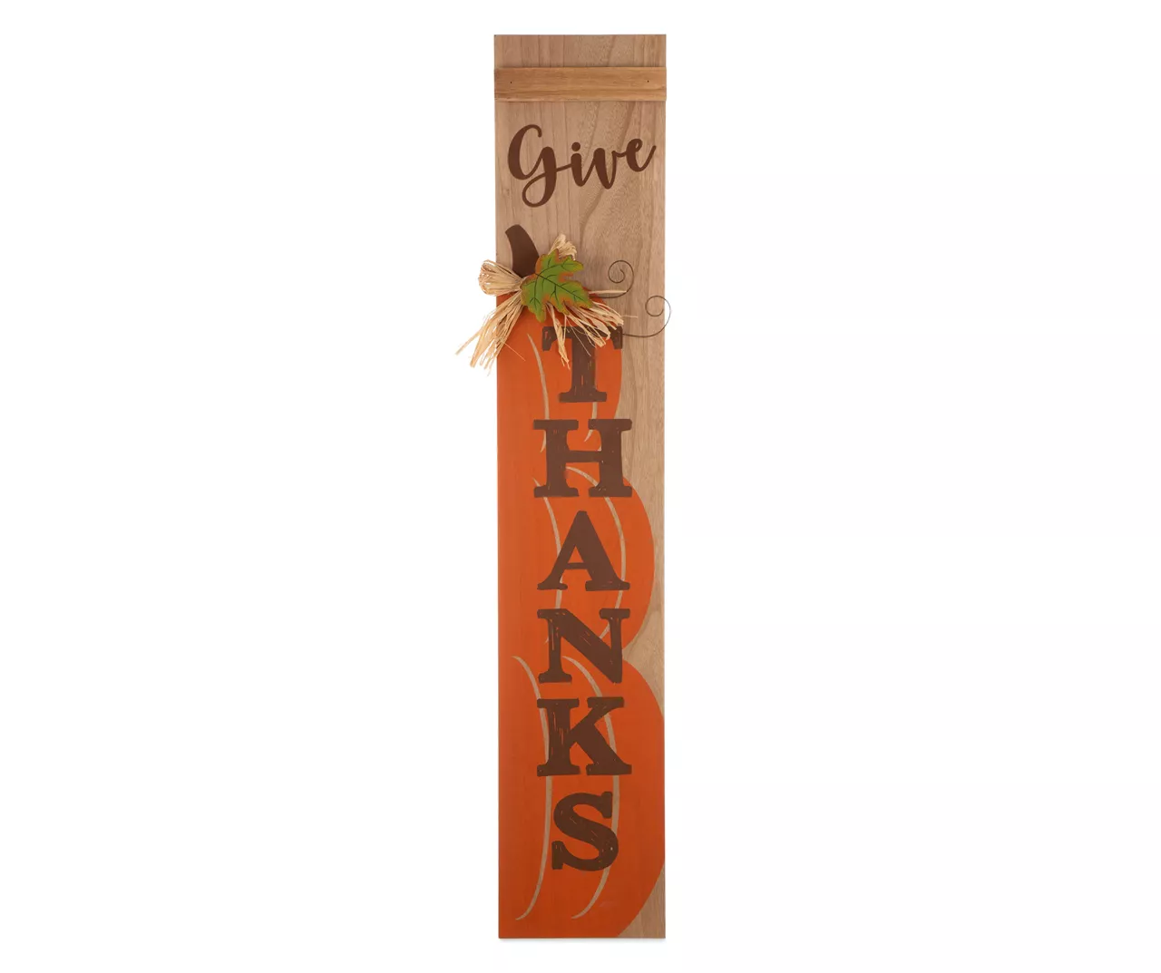 Share fall sentiments with your friends and family this Thanksgiving with this lovely porch sign. Finished in a lovely wood look that is decorated with charmingly stacked orange pumpkins, this sign is sure to spruce your home up just in time for Thanksgiving.