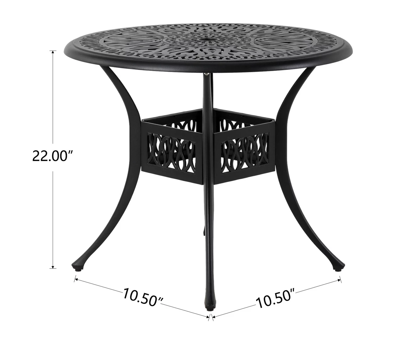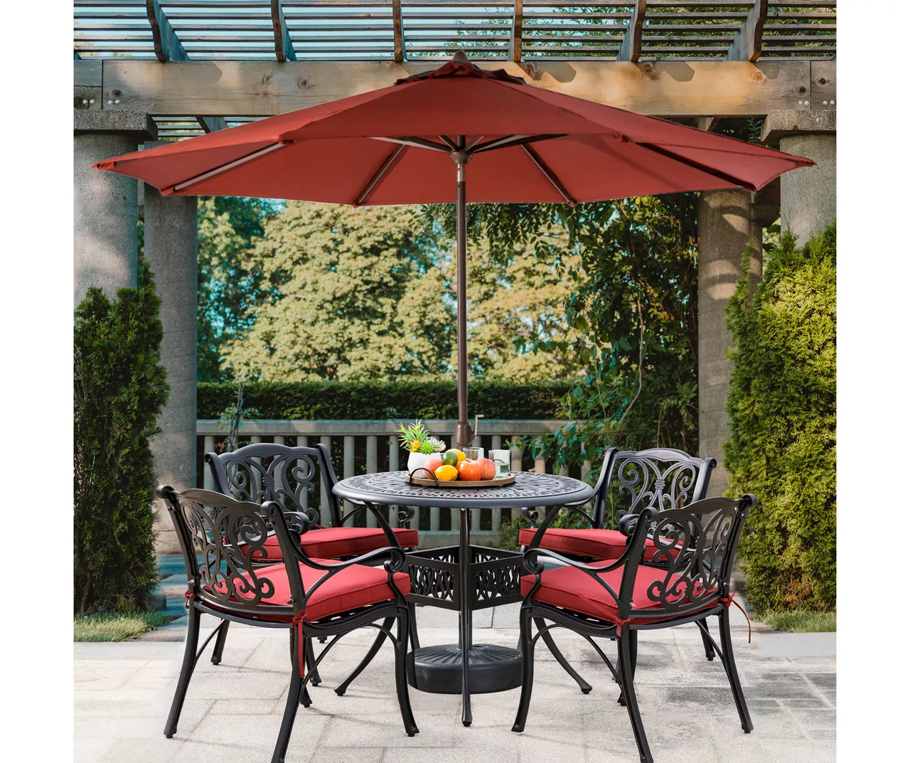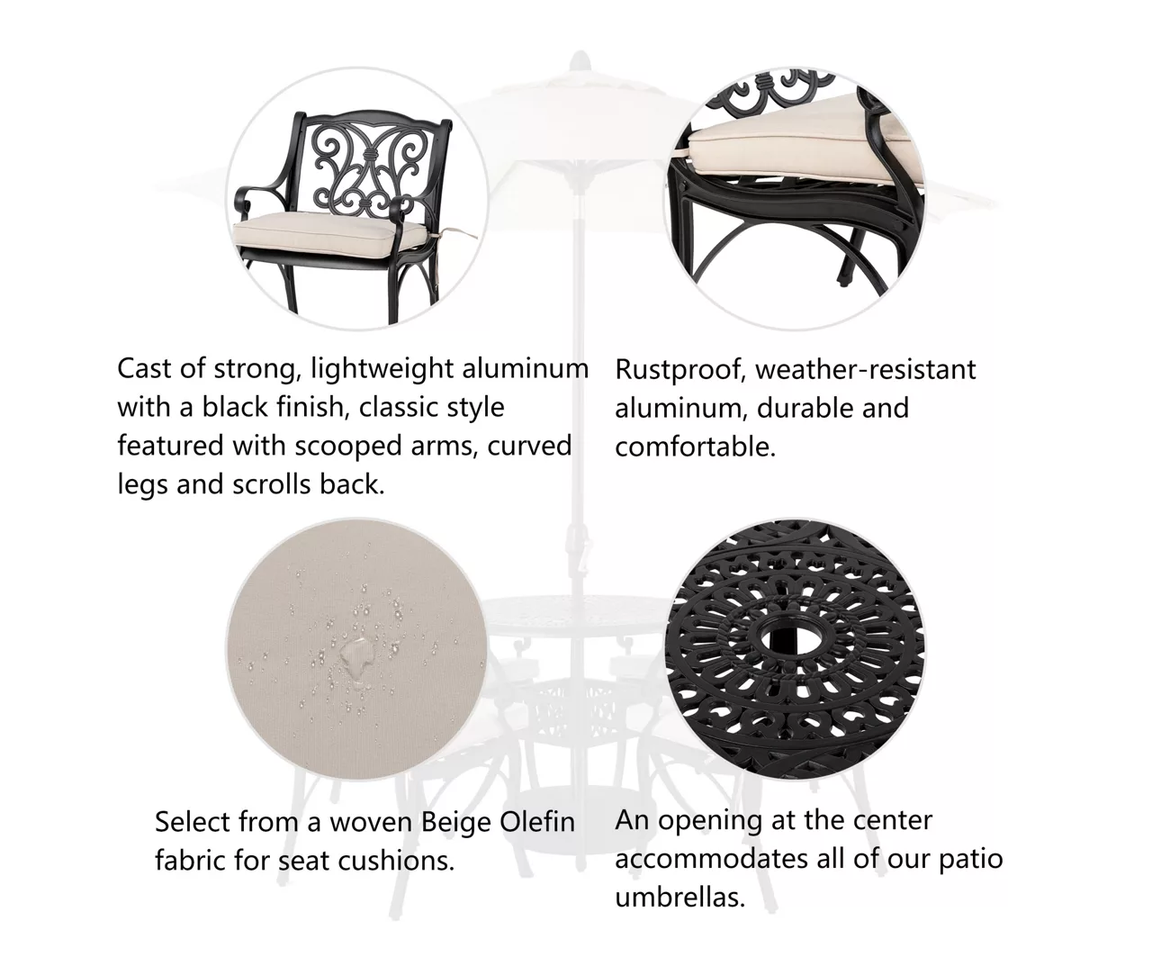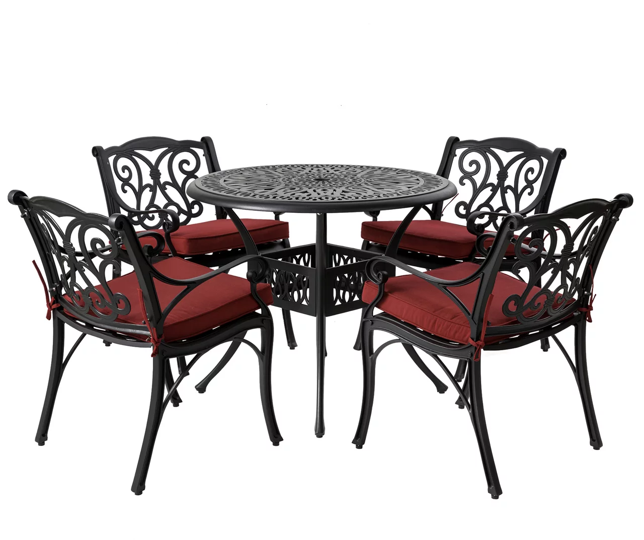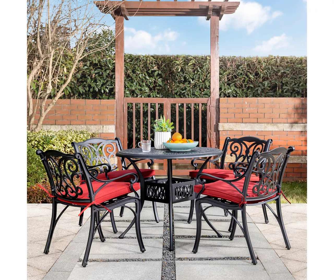 This five-piece dining set is a beautiful addition for your garden, patio or deck. Crafted from cast aluminum, each piece showcases a powder-coated black finish that prevents wear from weather and UV rays without any maintenance. Olefin wine red cushions are included for each seat, ensuring that your family and guests stay comfortable throughout the meal. This set features an open metal weave motif with a beautiful scroll design that highlights its elegant hand-crafted details.