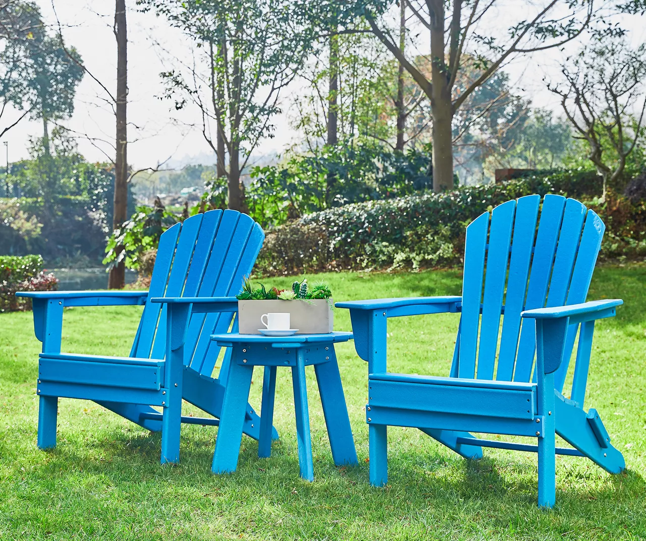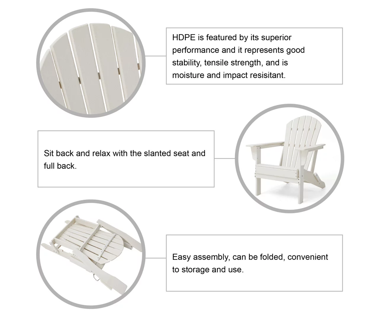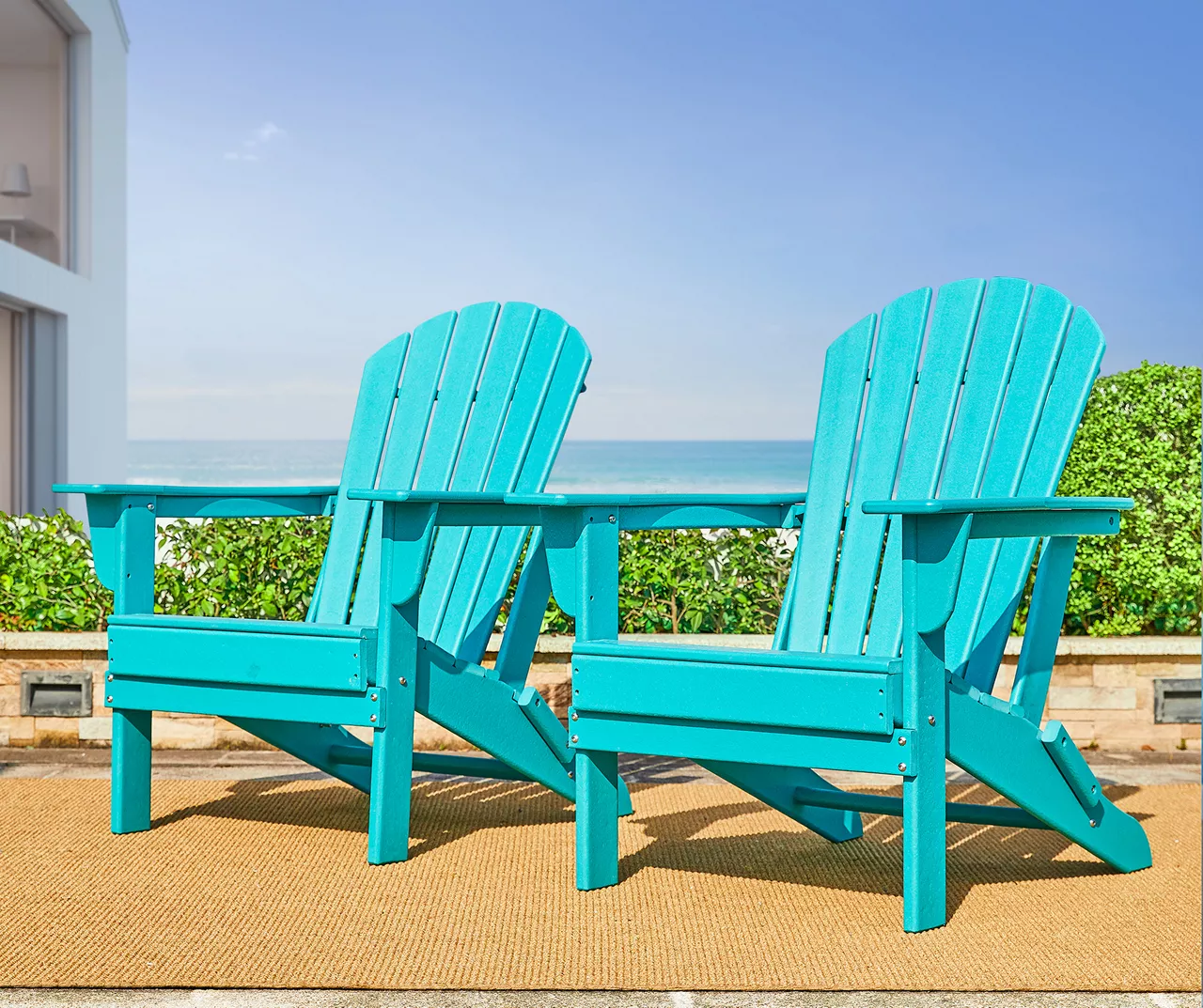 This set of two Adirondack chairs lets you enjoy casual conversations and happy hours with friends in your outdoor space. Each chair is constructed of durable and all-weather resistant high density polyethylene, making them easy to clean with little maintenance. The folding design of the chairs are great for when you need to take them on the road as slanted seating and full backs hug you in comfort. This versatile folding Adirondack chair set is perfect for your patio, porch, poolside, garden, backyard or any other outdoor space!