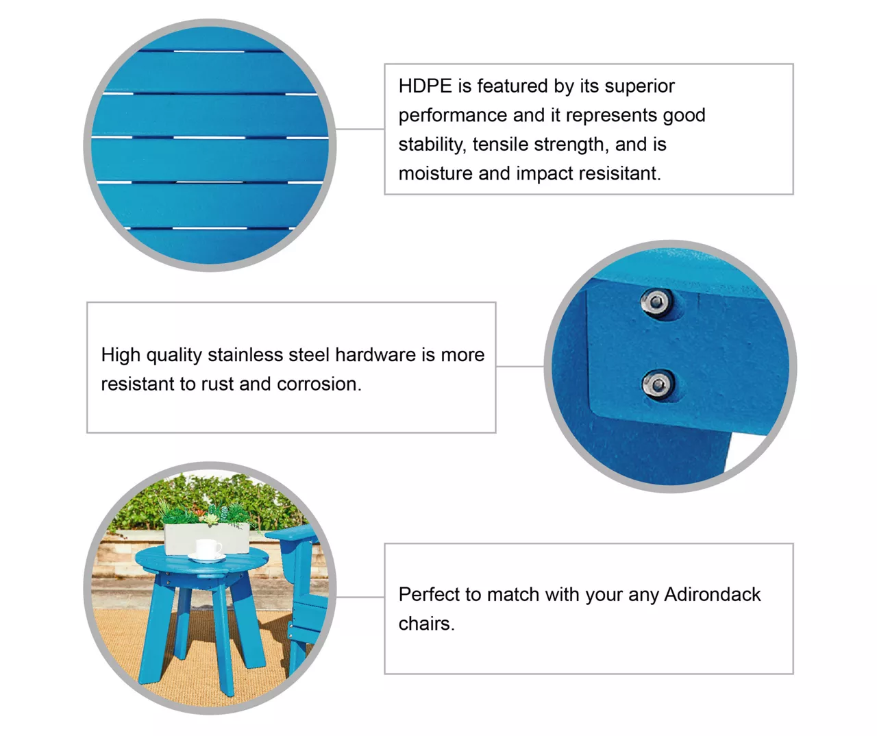 Keep your favorite items nearby outdoors on this Adirondack style side table. Constructed of durable and all weather-resistant high-density polyethylene, the table is very easy to clean and needs almost no maintenance. This patio side table is small but mighty. Just set your lovely flowers, snacks, drinks or cocktails to enjoy a good time!
