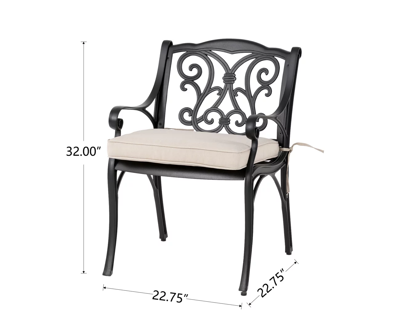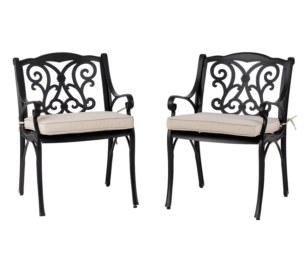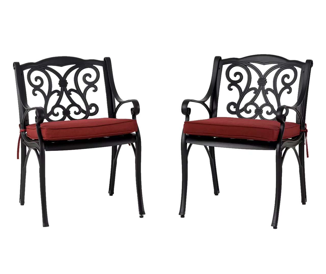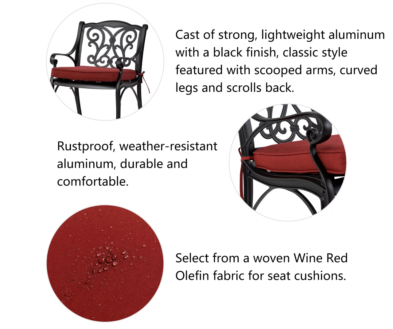 The two-piece chair set is a beautiful addition to your garden, patio, or deck. Crafted from cast aluminum, each piece showcases a powder-coated black finish that prevents wear from weather and UV rays without any maintenance. Olefin wine red cushions are included for each seat, ensuring that your family and guests stay comfortable throughout the meal. This set features an open metal weave motif with a beautiful scroll design that highlights its elegant hand-crafted details.