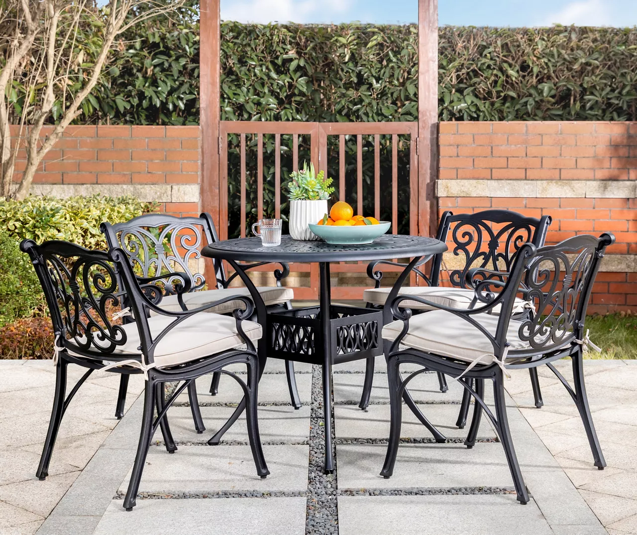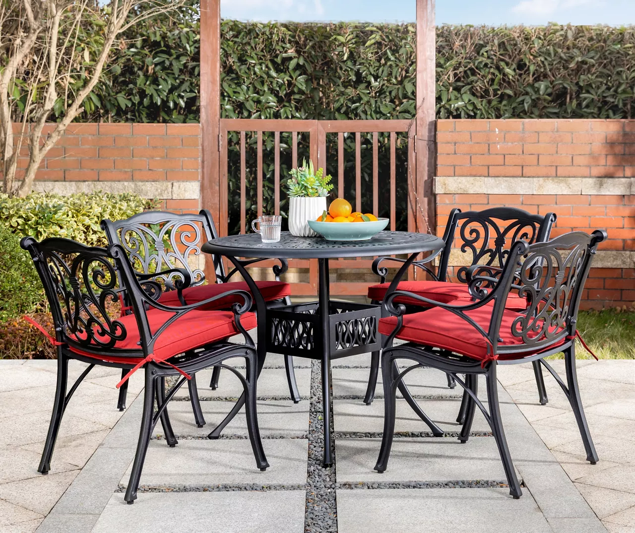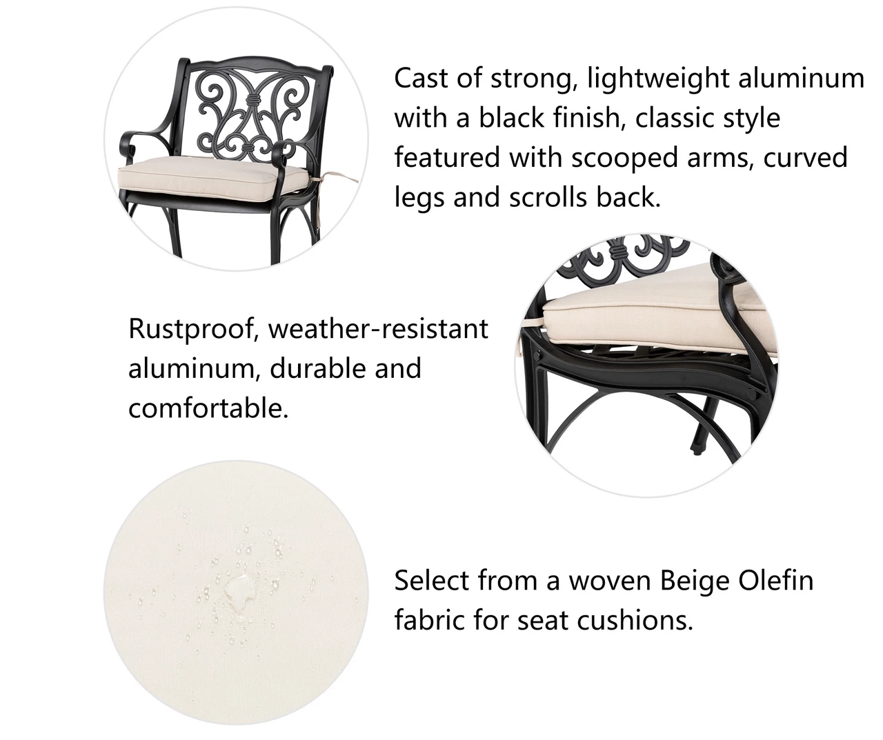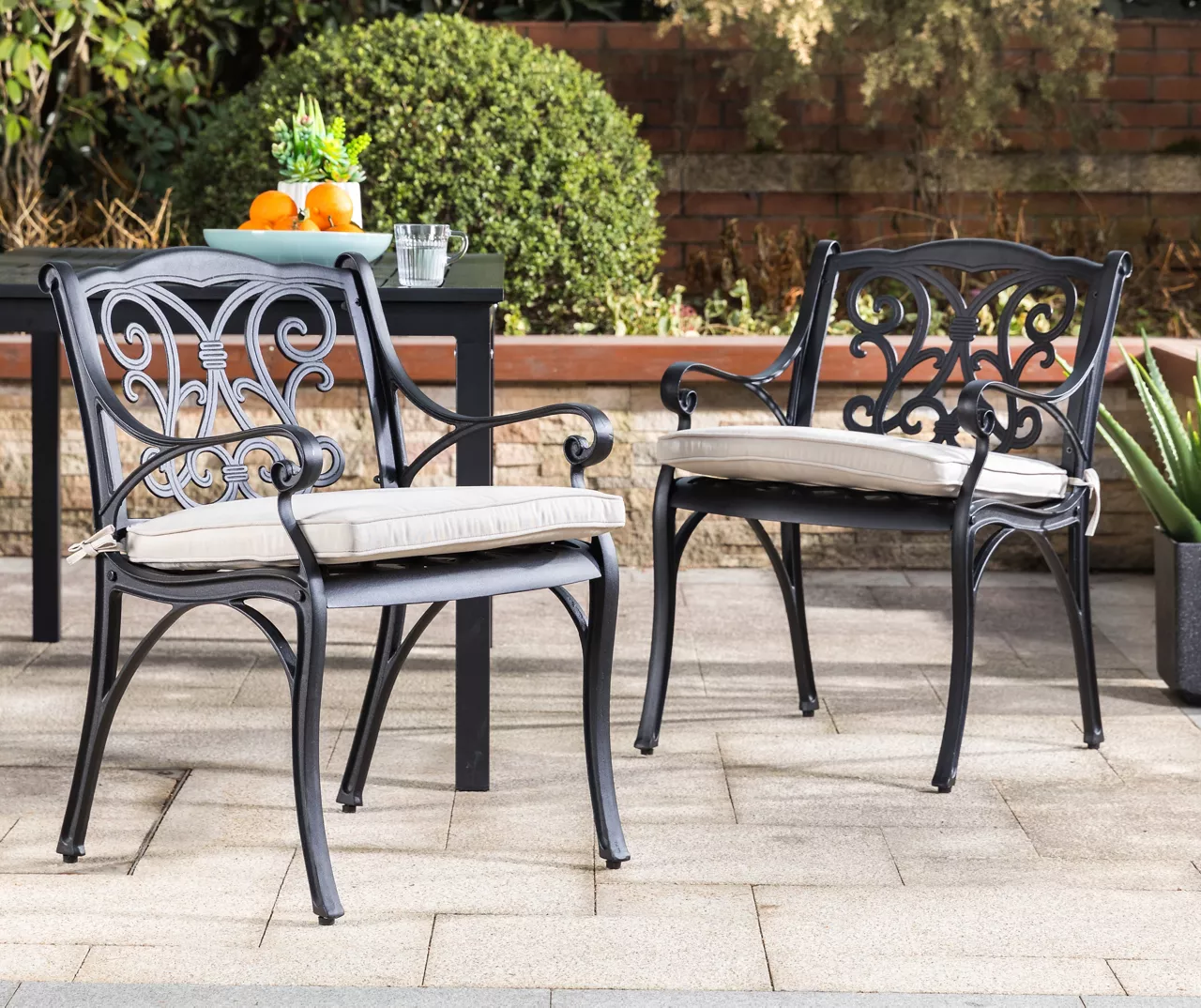 The two-piece chair set is a beautiful addition to your garden, patio, or deck. Crafted from cast aluminum, each piece showcases a powder-coated black finish that prevents wear from weather and UV rays without any maintenance. Olefin wine red cushions are included for each seat, ensuring that your family and guests stay comfortable throughout the meal. This set features an open metal weave motif with a beautiful scroll design that highlights its elegant hand-crafted details.