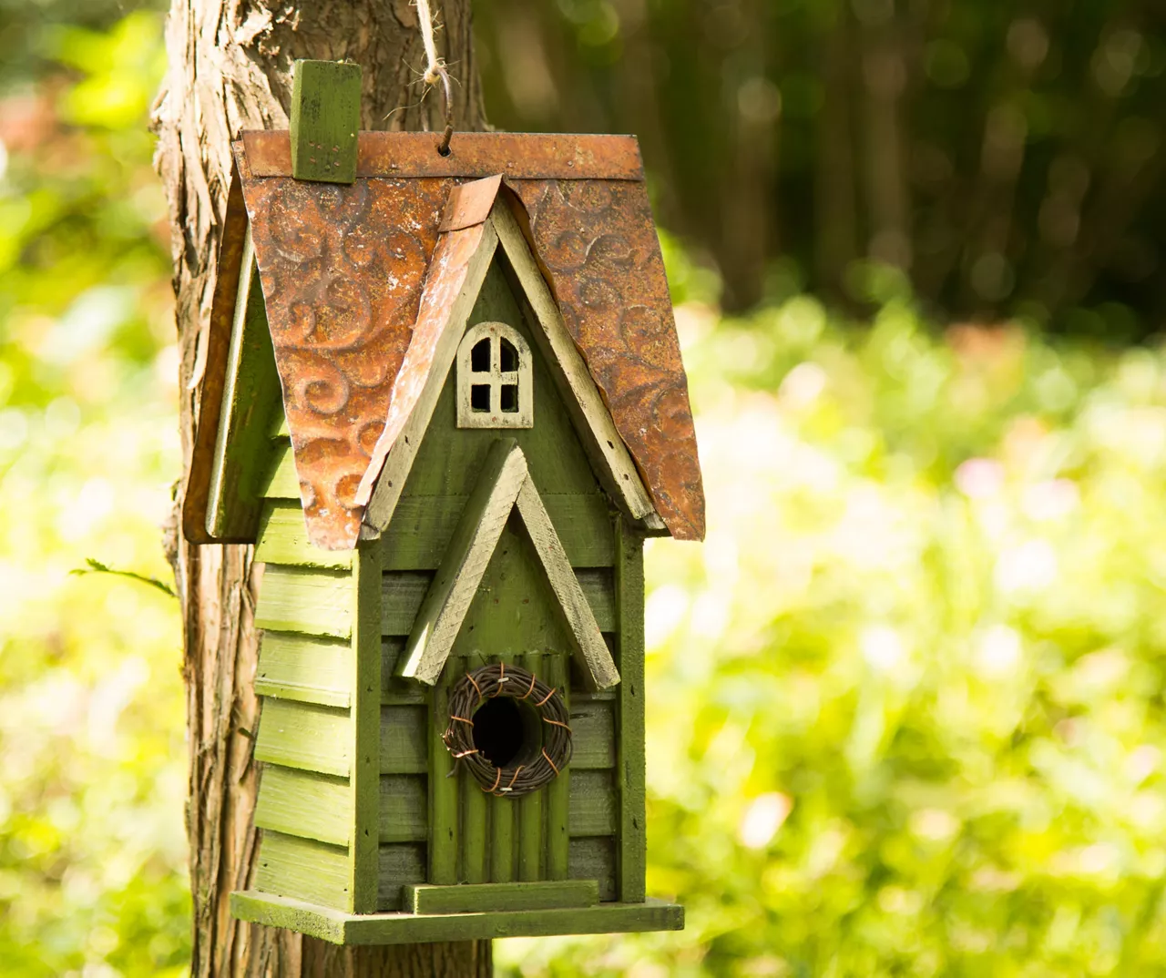 Let your twittering friends live in style with this wonderful birdhouse. Green wood panel look with white trim is featured in a distressed look for added appeal as its wreath-covered opening creates a whimsical way for birds to enter and exit. Complete with an antiqued metal roof with stamped scrollwork, it’s great for featuring in a garden or on the porch.
