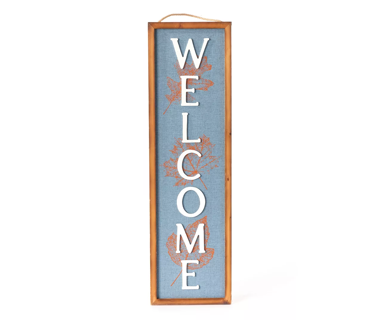 Bring cheers to the season with this vertical sign! “Welcome” is written down a blue background in large cut-out letters as leaf illustrations are stamped in orange. Showcased in a wood frame, this sign is a charming addition to a living space, kitchen or entryway.