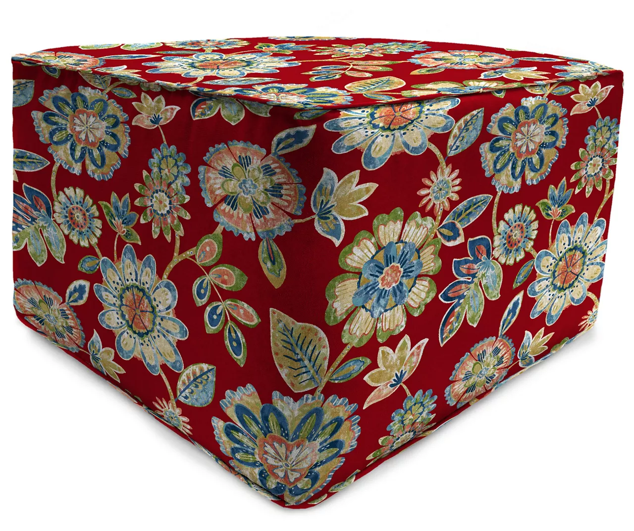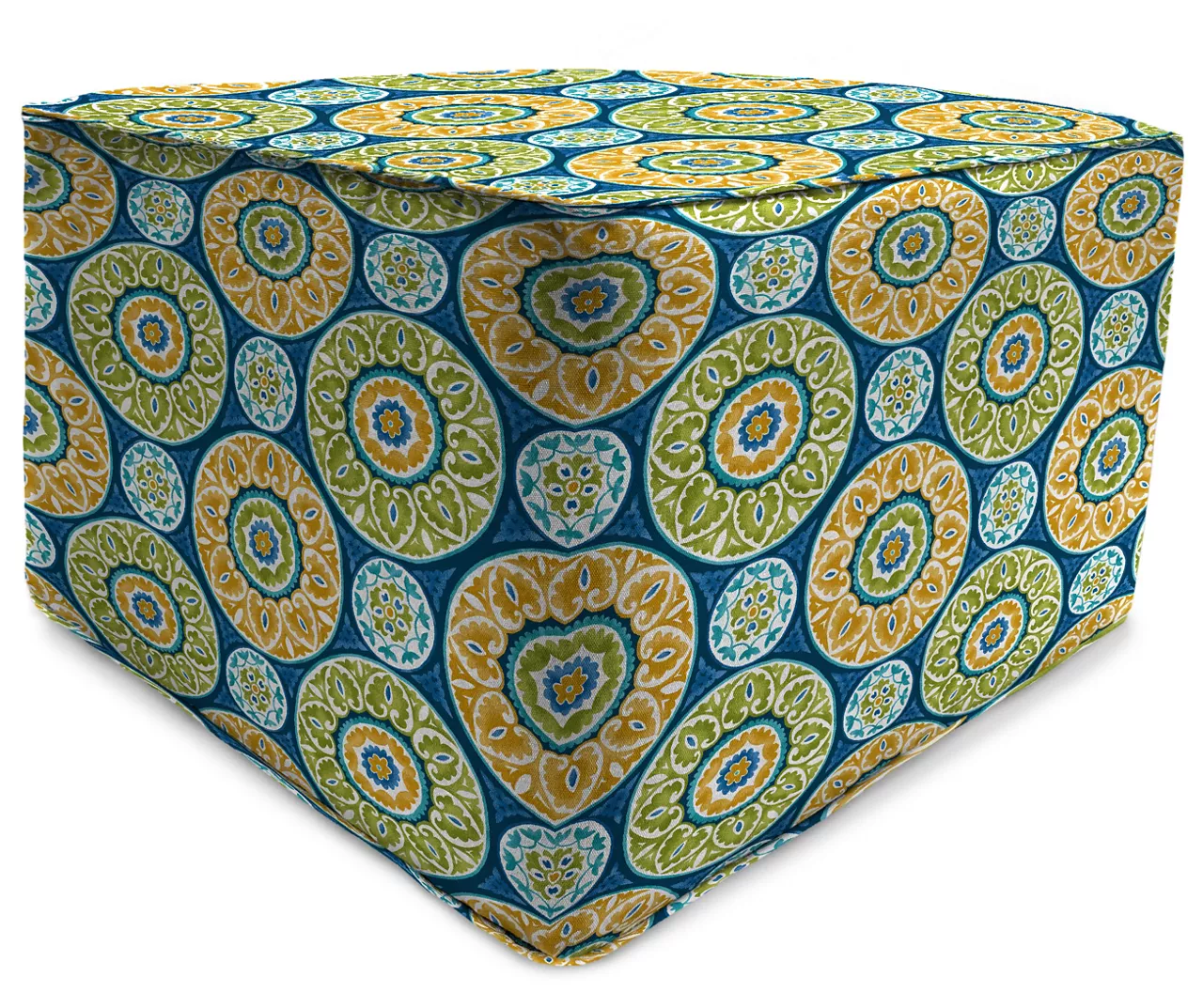 Accent your porch, patio or deck in lovely teal using this outdoor pouf ottoman. Made with spun polyester fabric for prolong use outdoors, its square-shaped design features a boxed edge design with matching welt trim for a tailored look. Filled with foam for added comfort, it can be used as a place to rest your feet or a comfy extra seat.