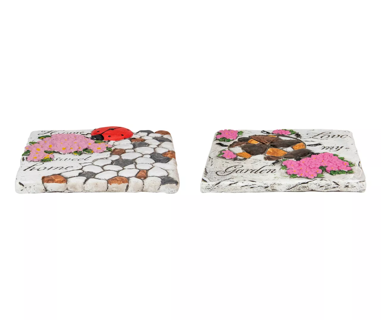 This set of garden stones will add a pop of color and welcome your guests in spring style. Each stone features a ladybug and floral design on a realistic faux stone backdrop. An embossed “home sweet home” and “love my garden” message offers sweet sentiments to every glance. Made from durable materials, this pair will greet your friends from season to season.