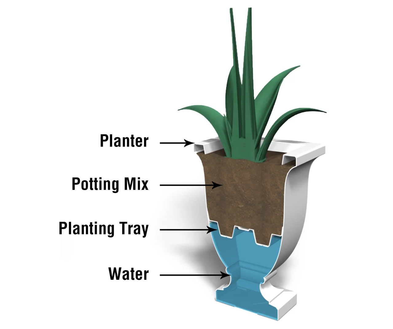 - Self-watering tray insert creates sub-irrigation water system and encourages root growth