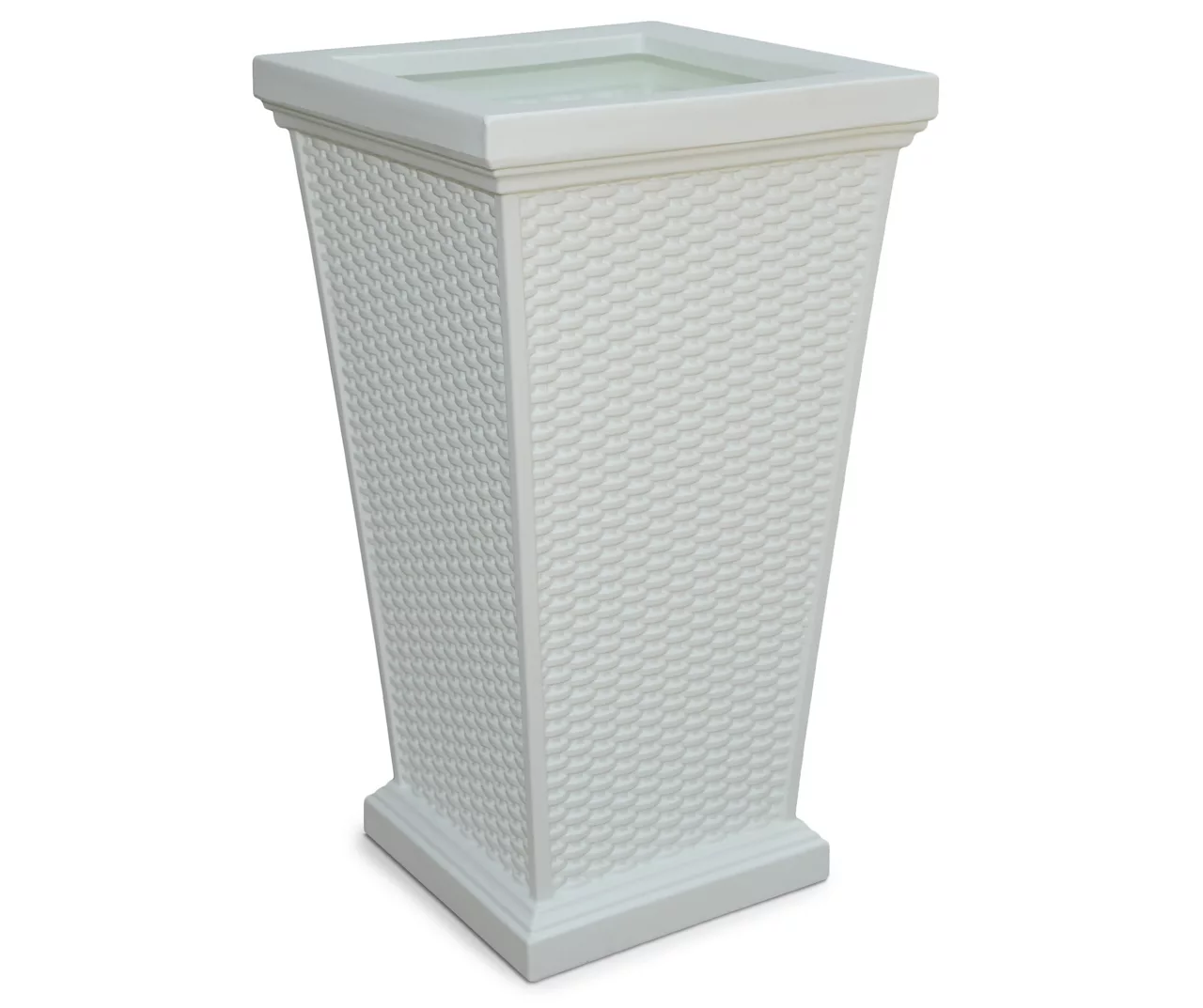 Add the look of wicker weaving without the risk of weather damage with this elegant Wellington white tall planter. Its charming design is perfect for the placement of seasonal flowers or plants. It will nicely adorn your porch, patio or deck for a touch of sophistication.