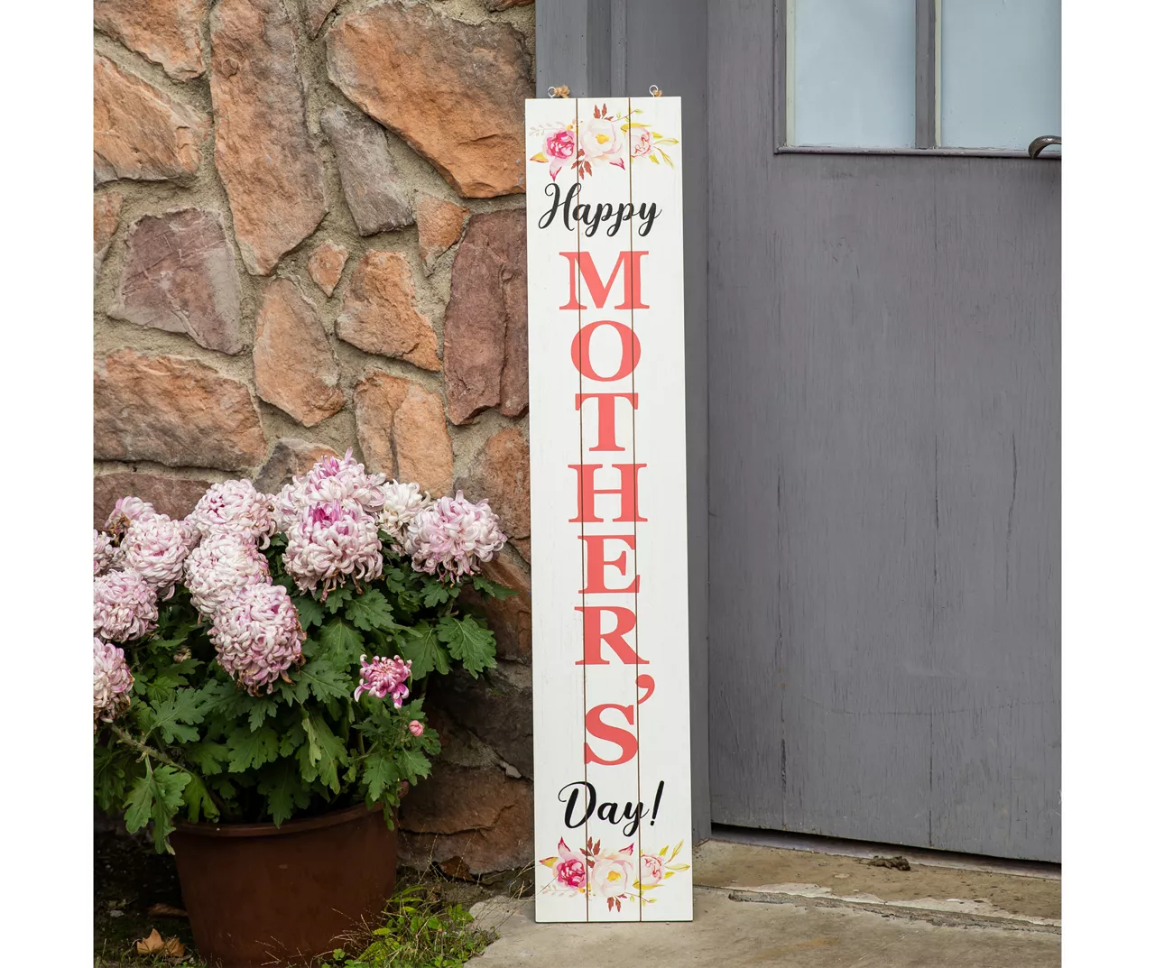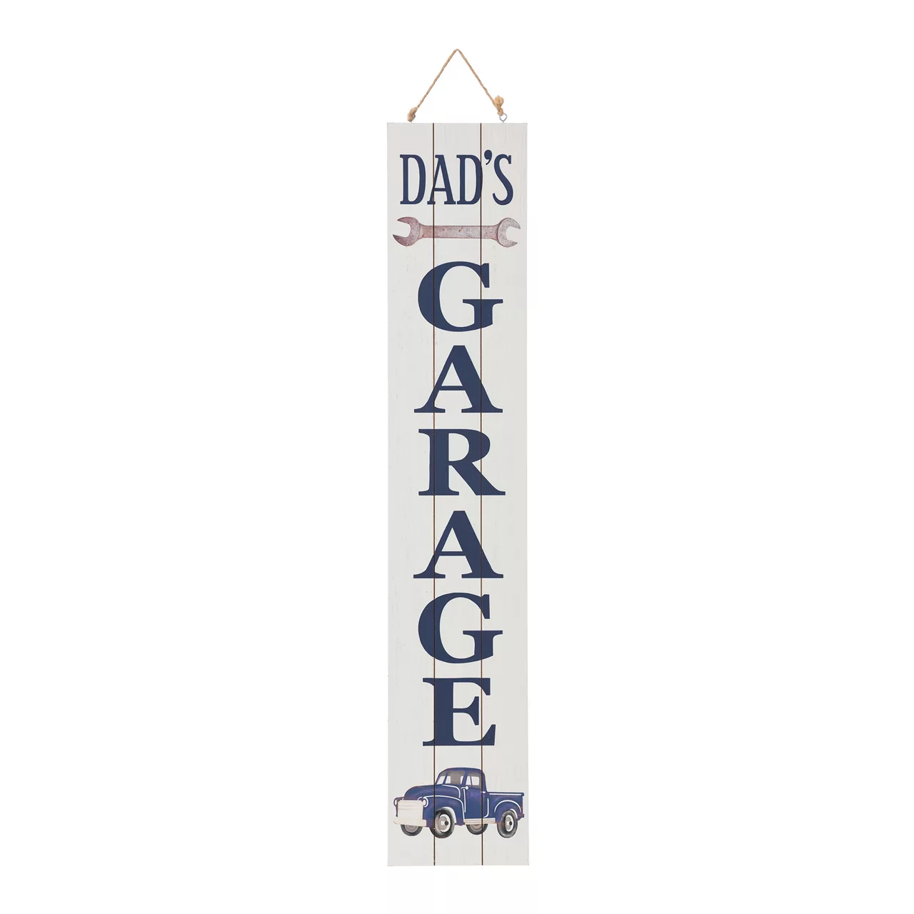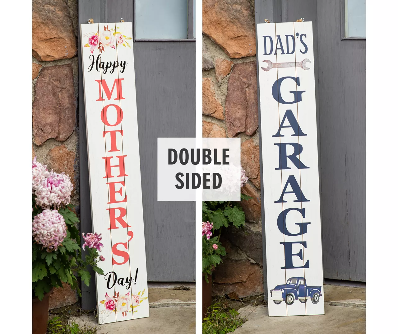 Celebrate mom and day throughout the year using this vertical sign! The white panel look features a “Happy Mother’s Day” message on one side as “Dad’s Garage” is featured on the reverse. Accented with floral, wrench and a truck, this sign is a charming addition to a porch, entryway or living space.