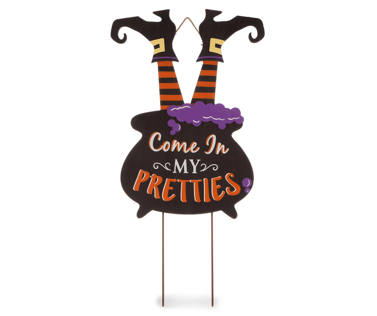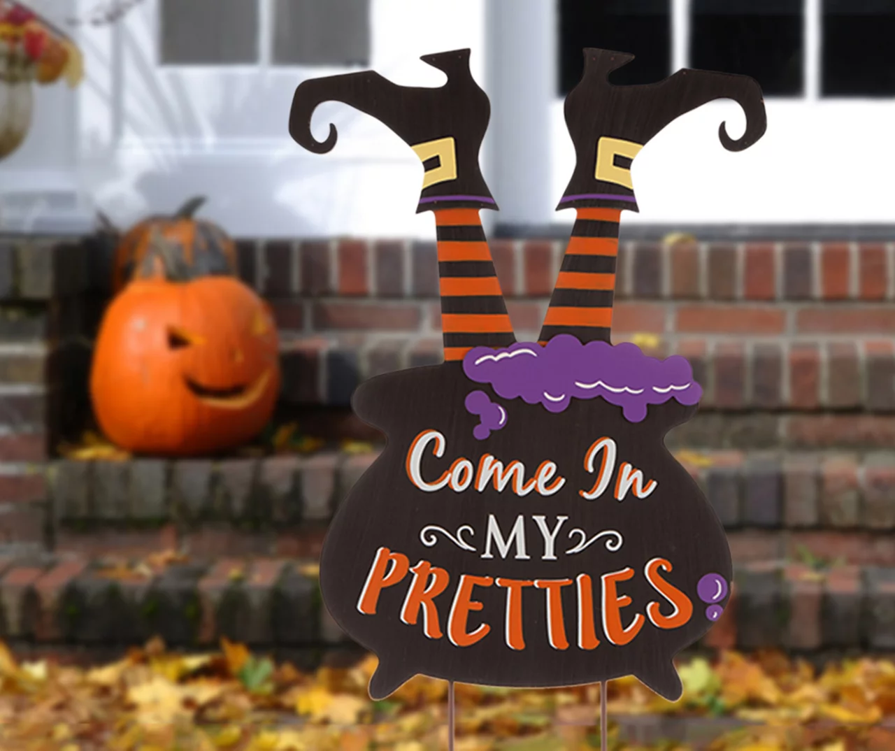 Help make your home a little spookier this Halloween with this lovely yard sign from Glitzhome. With a cute design of a witch’s leg sticking out of a cauldron and the fun message “come in my pretties”, this sign offers up creepy charm in spades. Whether you use it as a sign, a stake or a leaner, it’s sure to make your next Halloween one to remember.