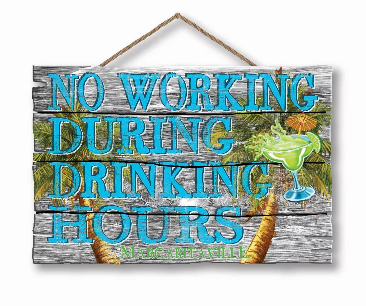 Give your space some extra colorful flair with a tropical twist when you add this hanging sign to your walls. It features a fun “no working during drinking hours” message with a printed wood grain backdrop for breezy boardwalk style.