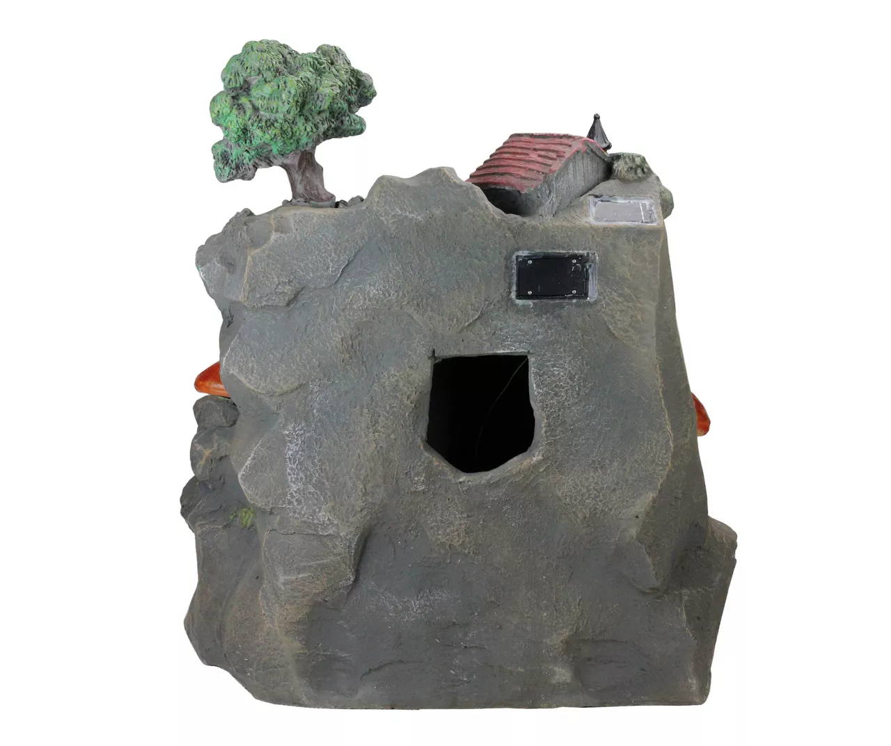 - Rock formation design with waterfall illuminates from solar-powered lighting