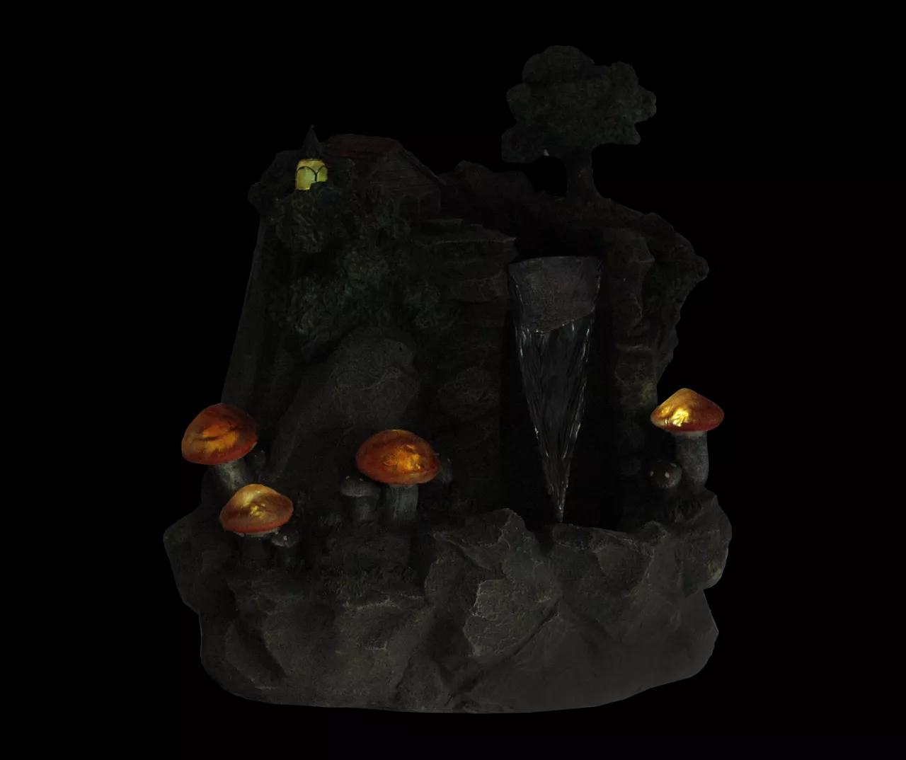 - Sculpted house by a cliff with trees and mushrooms