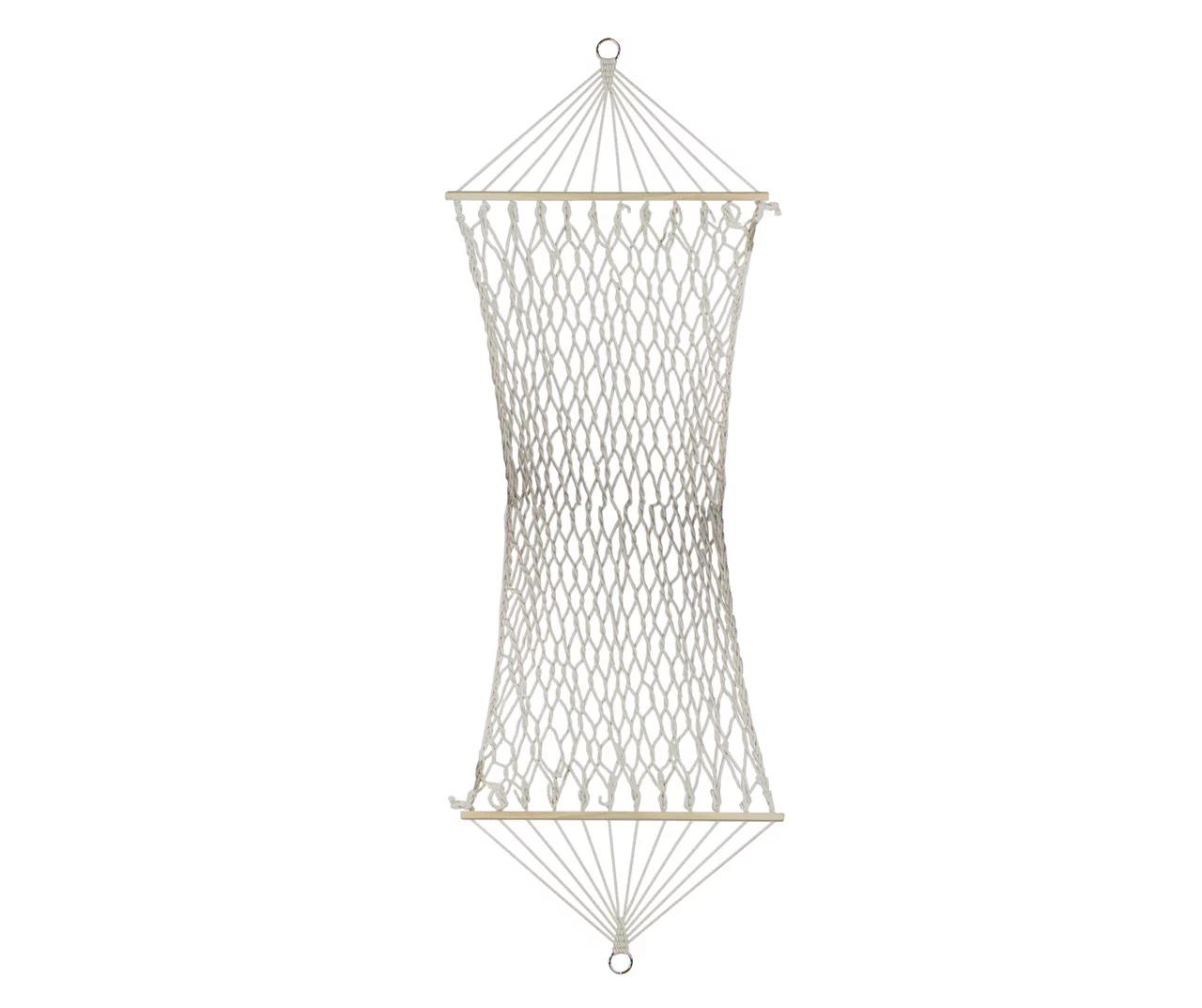 Relax in style with this portable hammock. A comfy addition to your outdoor space. This hammock has an ivory macrame lattice pattern and wooden bars to attach the hammock to a stand. Perfect for hanging between trees or on your balcony.