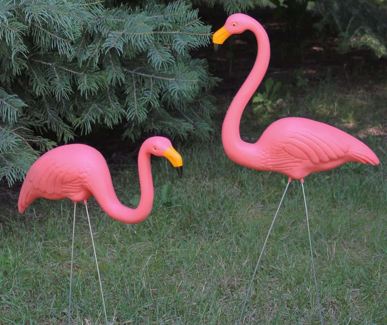 An enduring part of the American landscape, pink flamingos have been popping up in lawn decor for over 70 years! With a durable metal stand and sturdy lawn stakes this outdoor flamingo set brings a modern touch to a classic decoration. These durable, weather-resistant garden decorations are designed to last for many years to come.