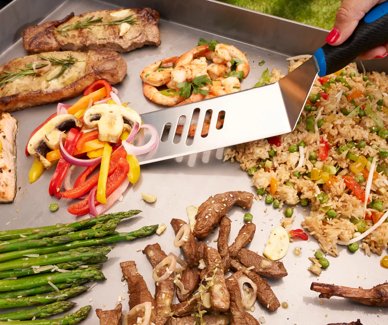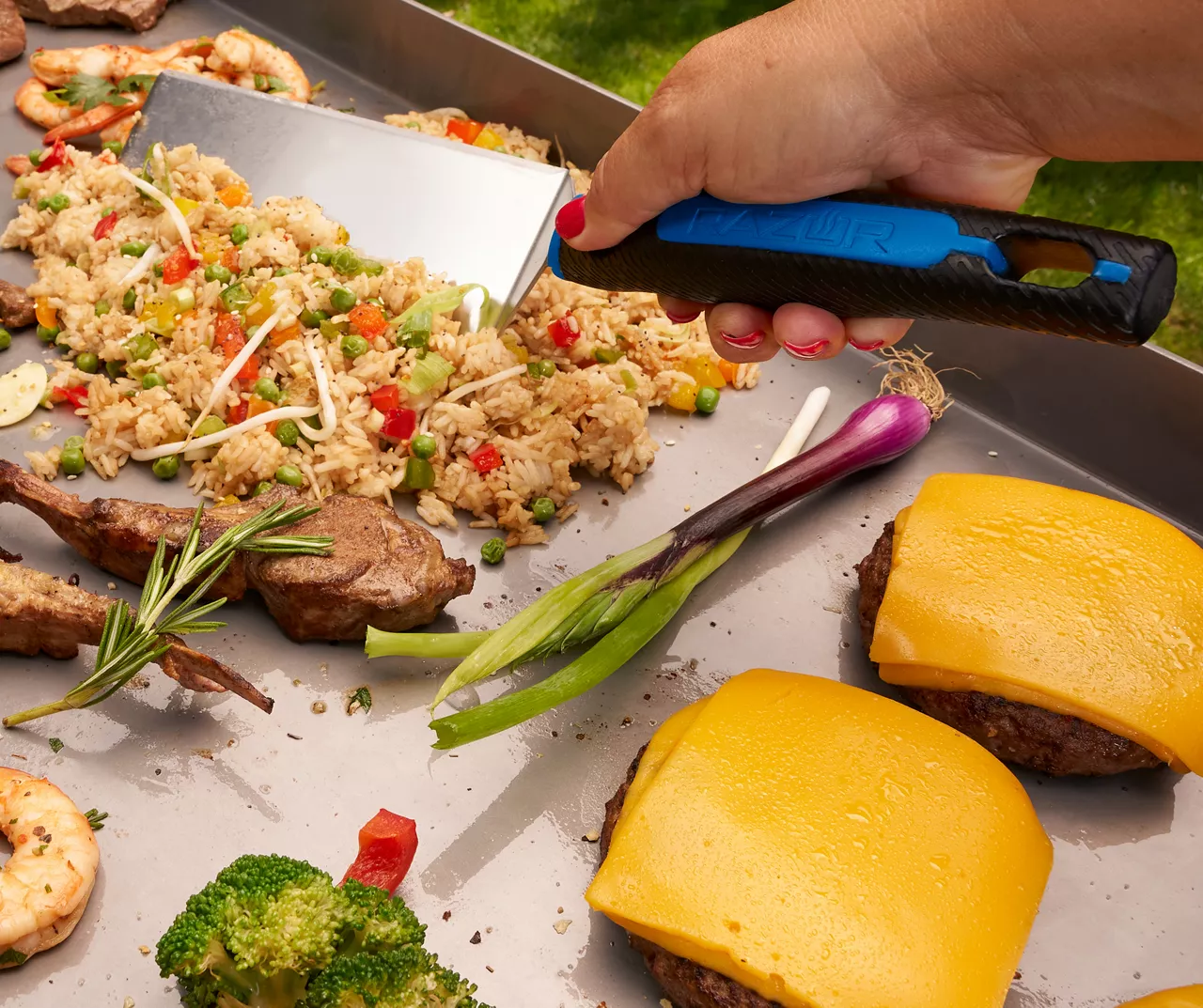 - Steel chopper/scraper dices, chops and cleans the griddle