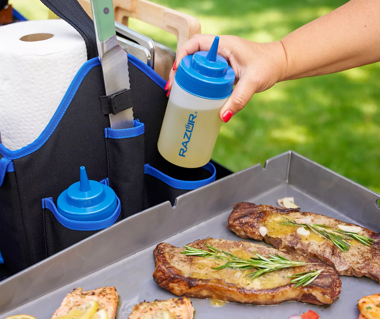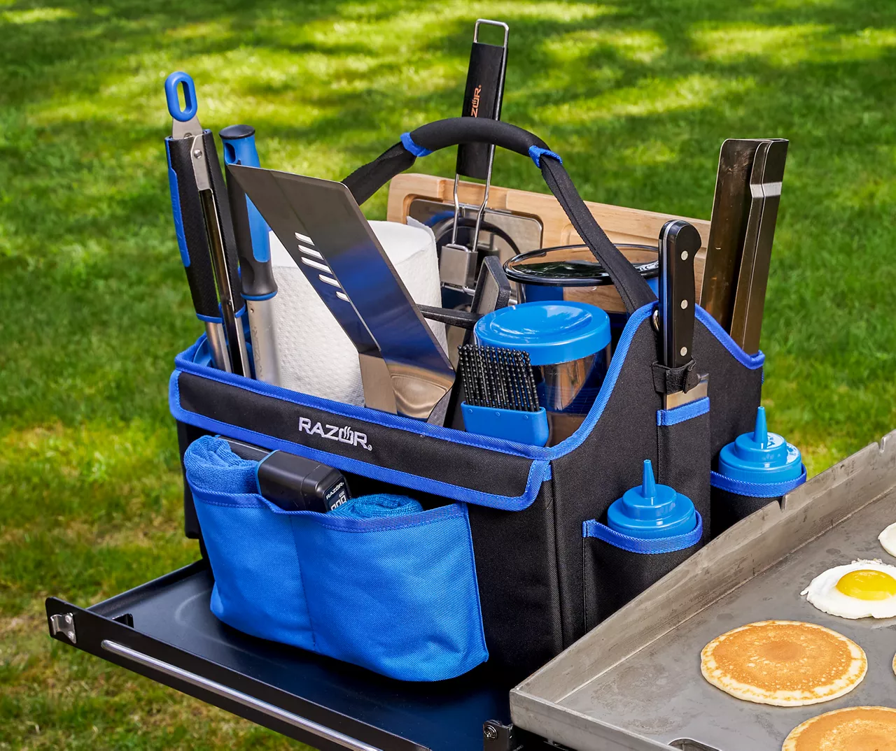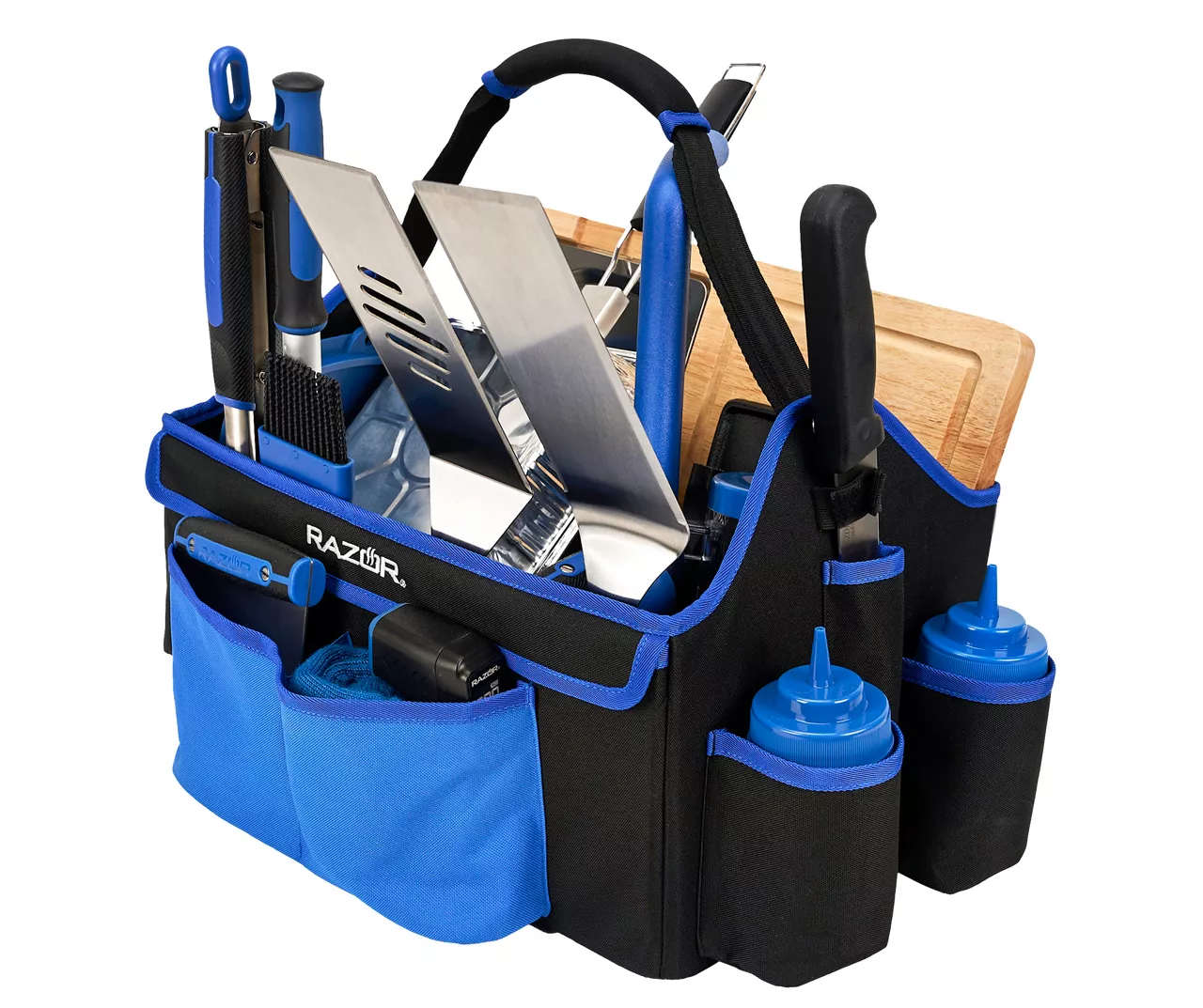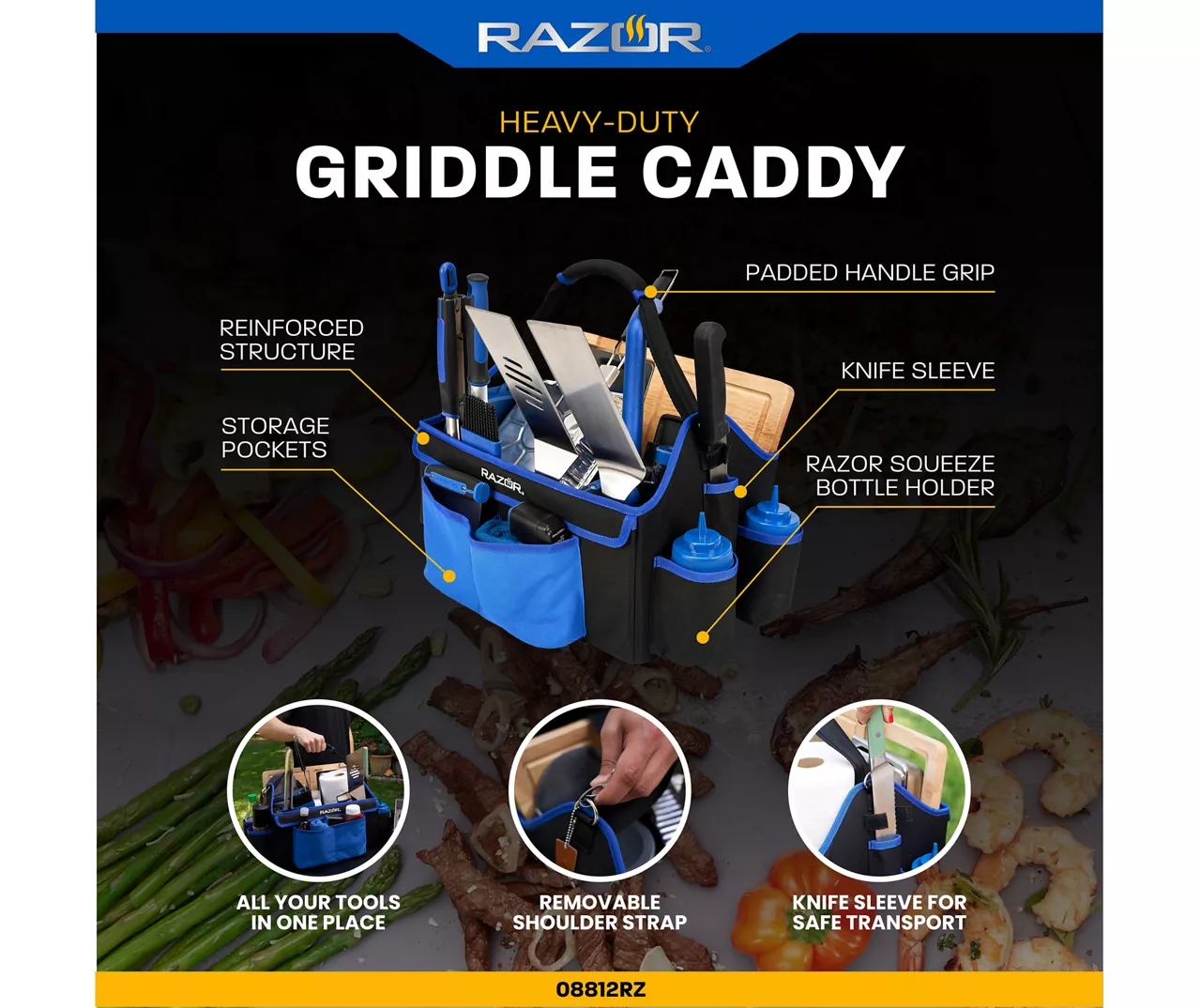The Razor heavy-duty griddle caddy is your one-trip to the griddle tool holder. Made with oxford fabric, this high quality caddy is built to last. With a reinforced structure, padded handle grip and numerous pockets and slots, this caddy can hold all of your griddle accessories, and more! The open top design makes access to your tools a breeze, keeping everything organized and all in one place. The protective knife storage sleeve provides a safe way to store and transport sharp objects such as steak knives. A removable shoulder strap is included for hands-free carrying, this makes it possible to carry your food and your tools all in one trip. The side pockets are designed to fit the razor squeeze bottles and inside includes elastic straps to keep tools in place and objects from falling over. Never leave your tools behind again! With this caddy youโll have everything you need for griddling right within armโs reach.