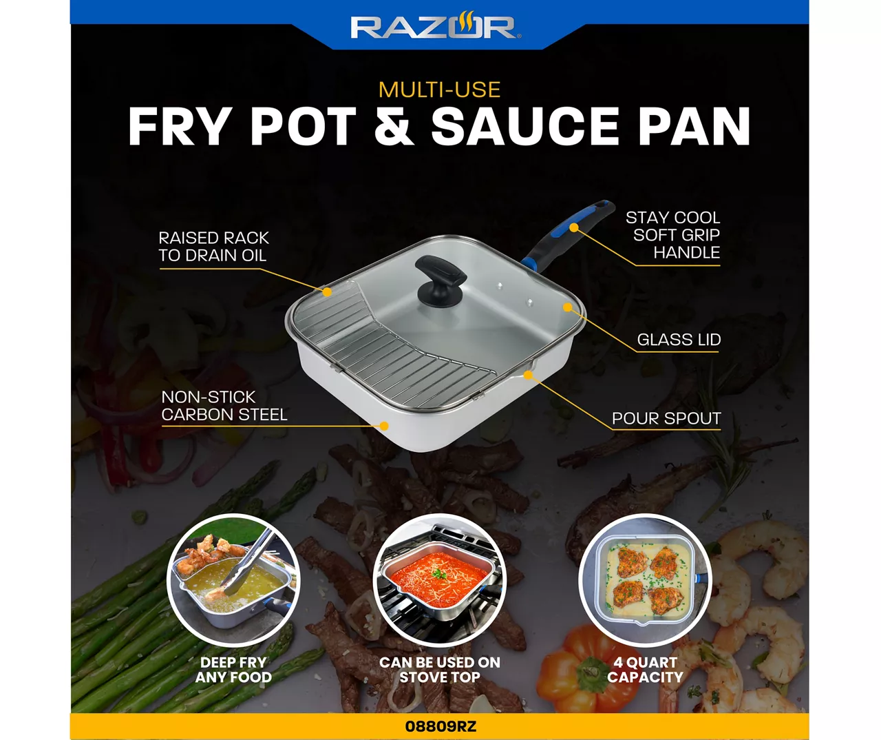 If you love your griddle, you’ll love the Razor multi-use fry pot and sauce pan. Deep fry all of your favorite foods including shrimp, chicken and onion rings. The convenient removable rack allows you easy access to drain the oil when you’re finished. Non-stick coated carbon steel is easy to clean and even comes with a lid to keep popping oil safe. The stay cool soft grip handle will protect your hands from the heat while allowing the ease of comfort while gridling. With a large 4-quart capacity, you can make anything in this sauce pan!