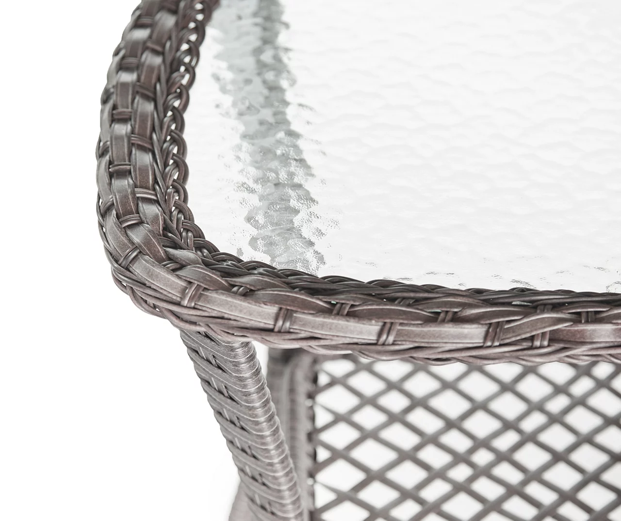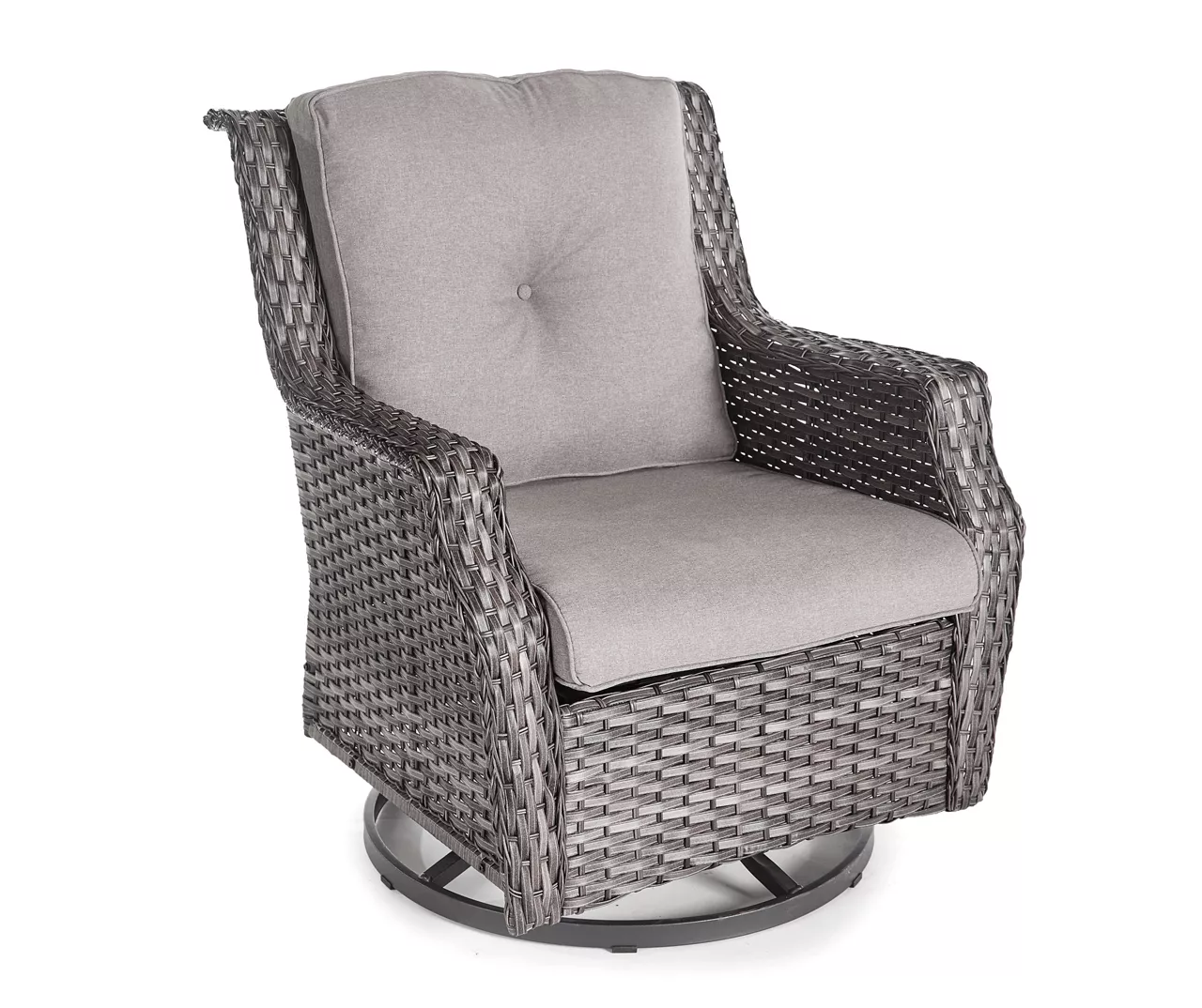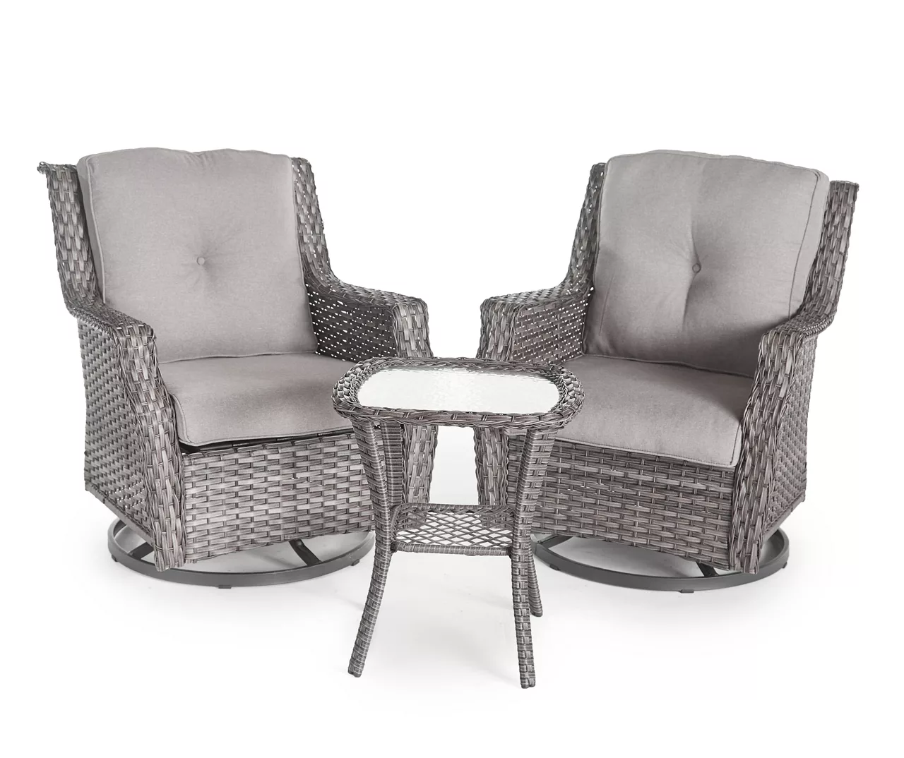 Swivel and glide in the sunshine relaxing on this Rockbridge seating set from Real Living. Each piece features a powder-coated steel frame wrapped in handwoven all-weather wicker. As you sink into the neutral weather-resistant cushions, the tempered glass side table keeps items and drinks within convenient reach.