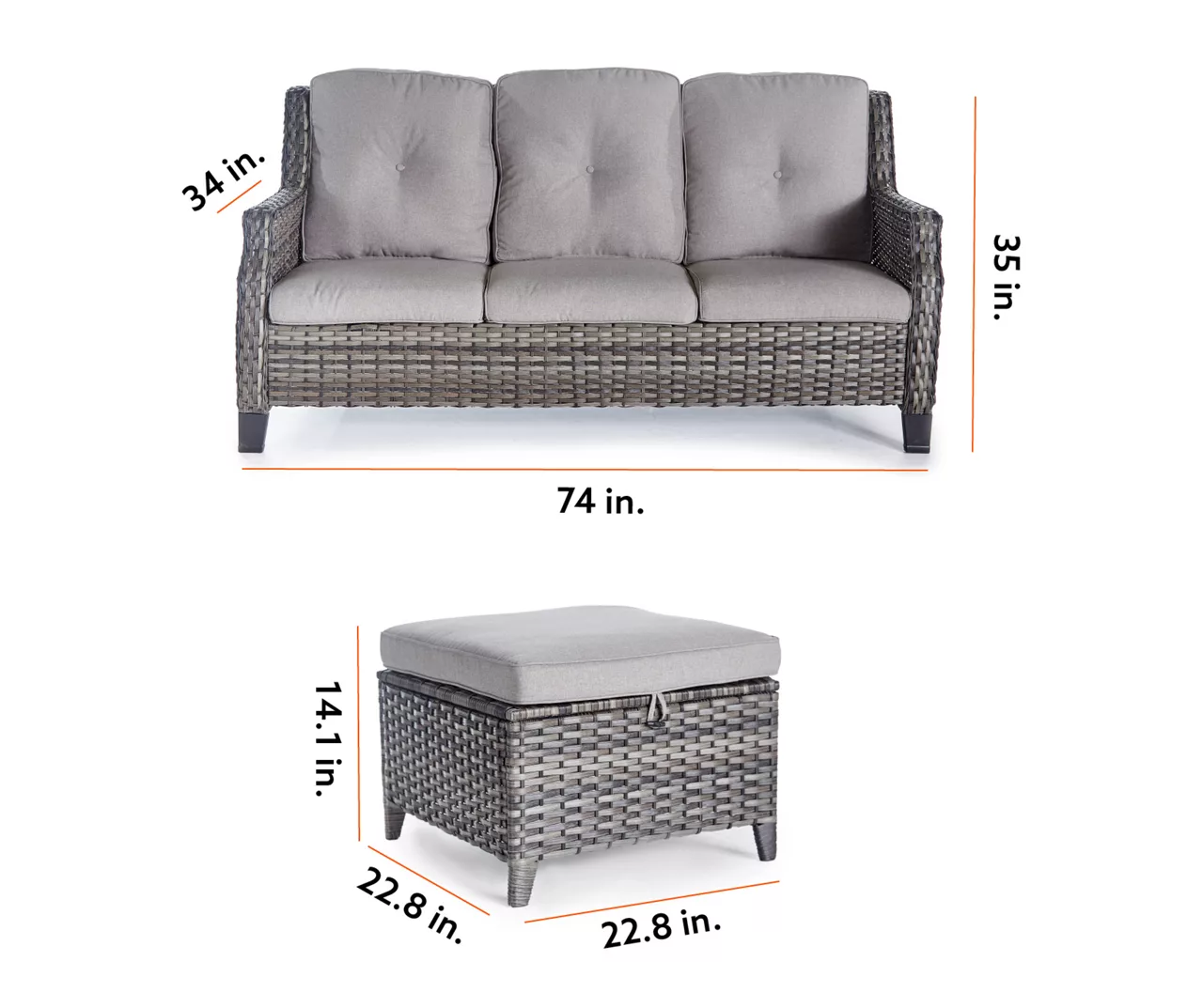 - Ottoman product dimensions: 22.8″L x 22.8″W x 14.1″H (each)