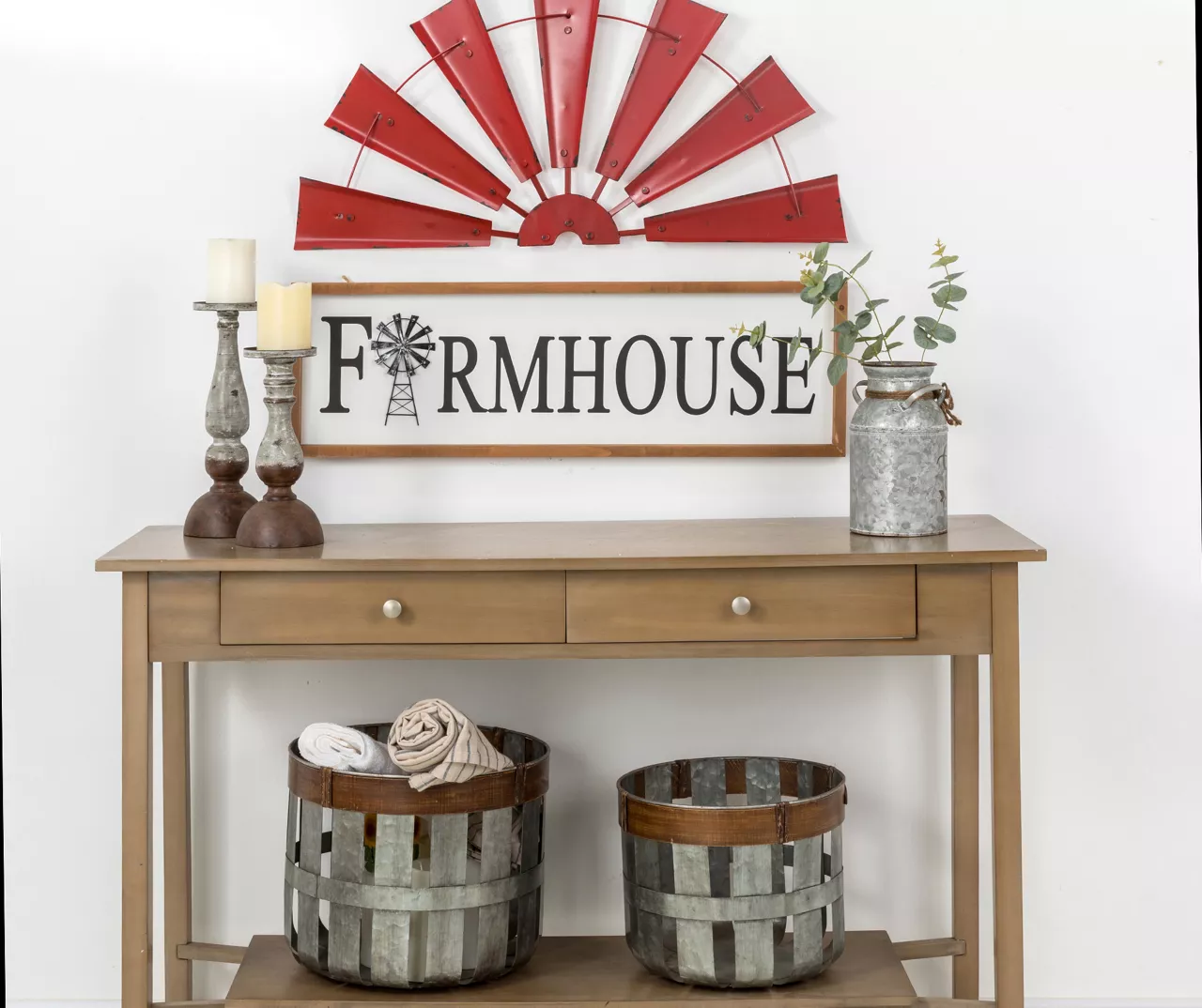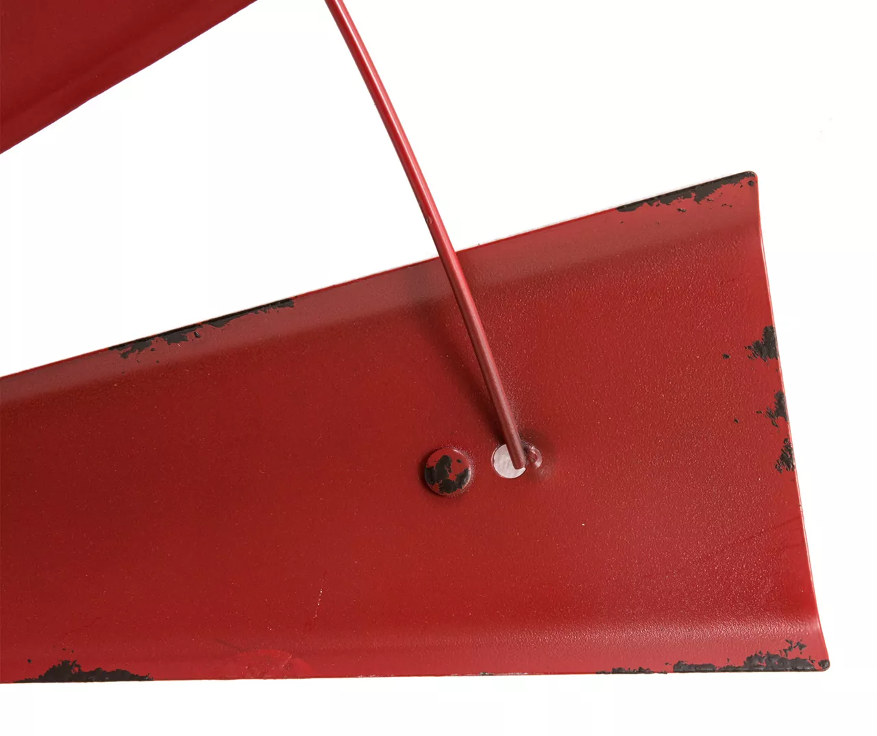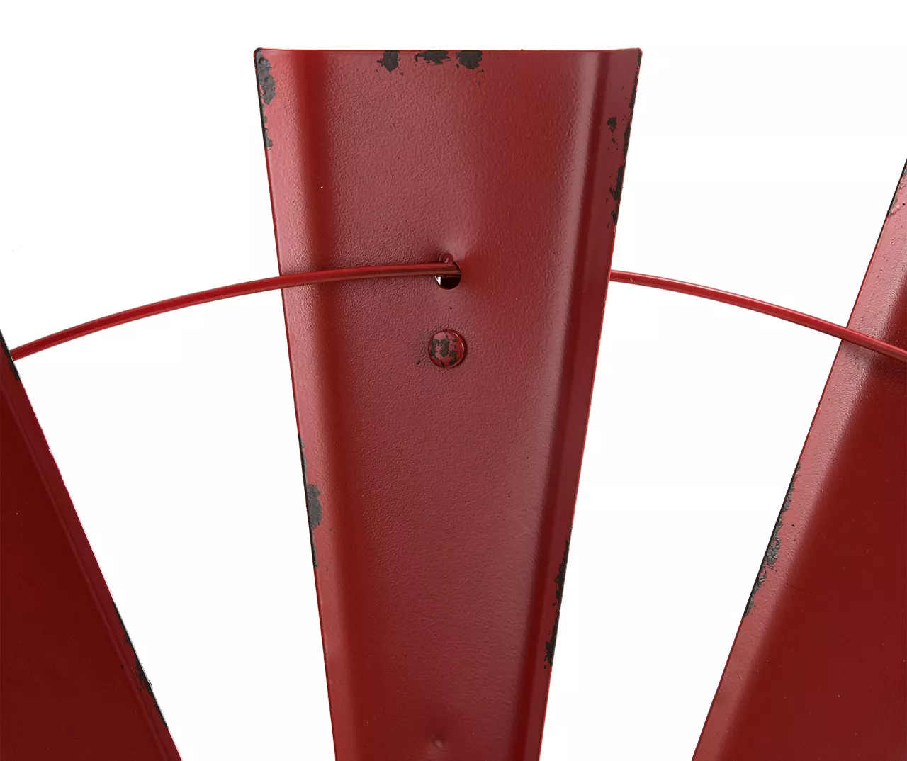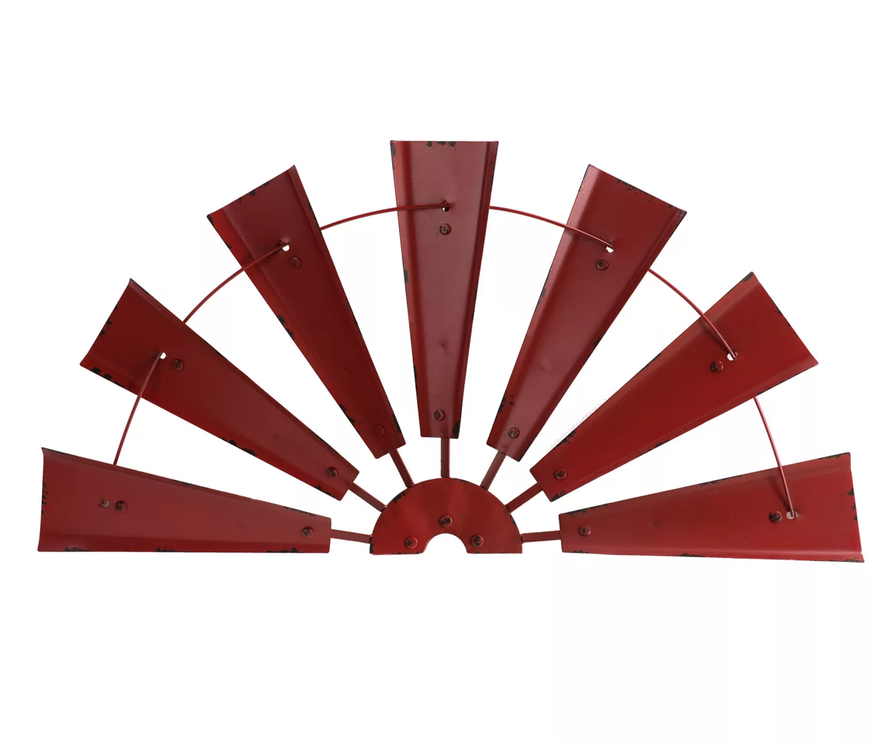 Looking to brighten up your walls with a pop of color and country décor? Adding this half windmill wheel will add a fresh look with a touch of rustic style. The design features red painted metal with a weathered finish. Perfect for styles from cottage to modern farmhouse, this piece can even be displayed outdoors.