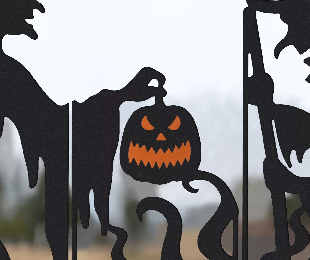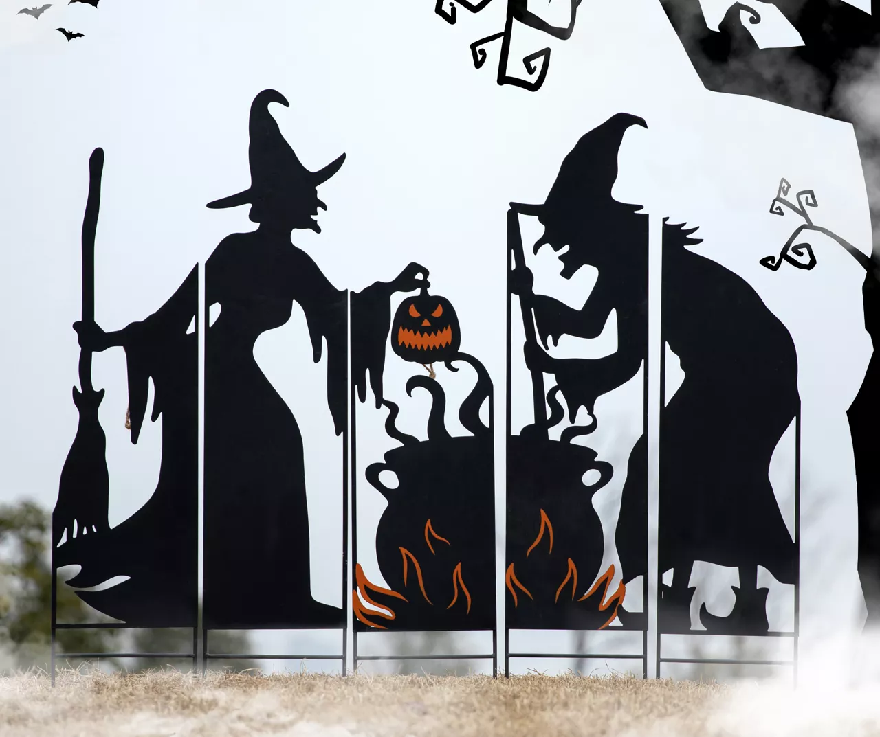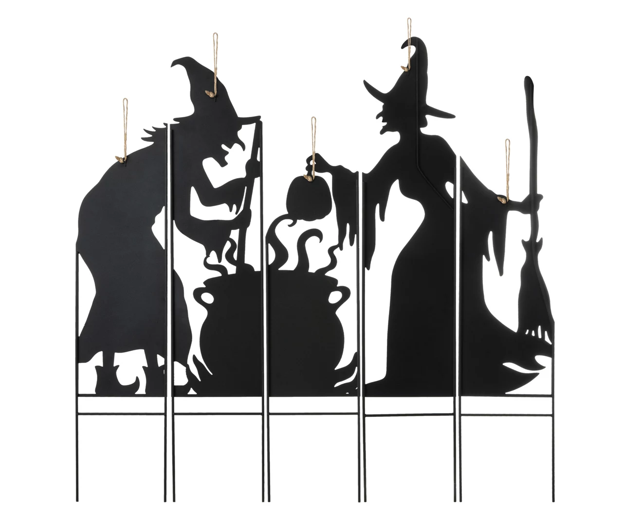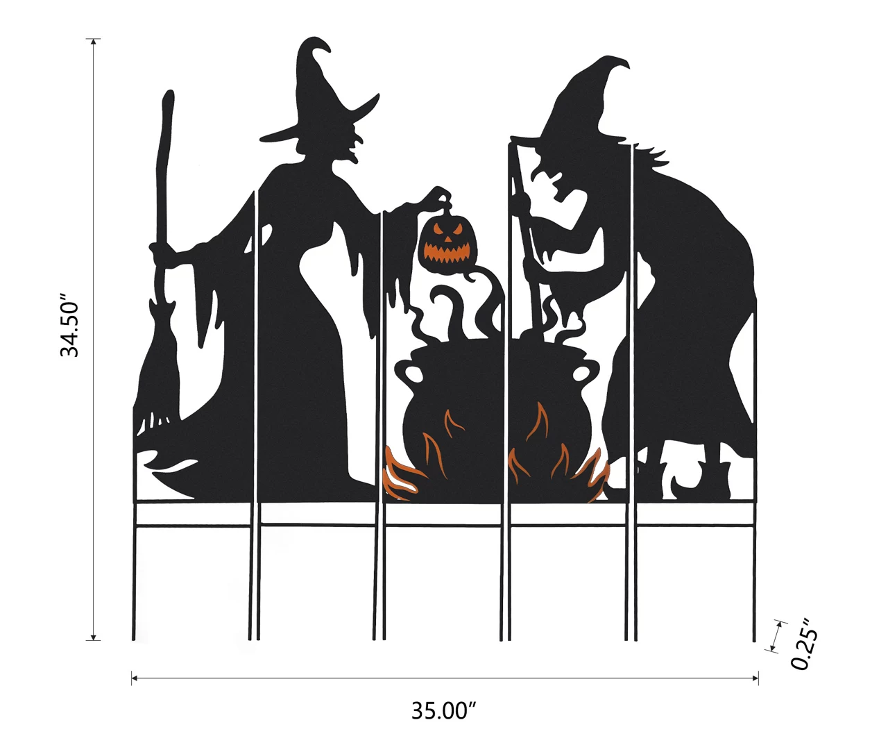 Give your neighbors a fright by creating your own personal haunted house with this spooky witches silhouette yard stake set. This black metal figure will cast two witches warming up the big black cauldron. This gives your home a spirited dĆ©cor for the Halloween season. The silhouette’s base is affixed to a yard stick for easy installation into the ground. You will definitely give your trick or treaters a pleasant scare.